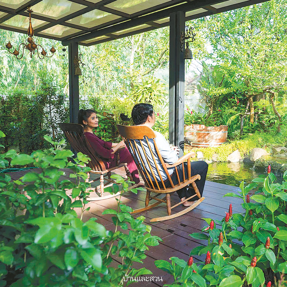 8. การได้อยู่ท่ามกลางธรรมชาติ นอกจากช่วยให้เกิดความรู้สึกสบายกายแล้ว ยังช่วยเยียวยาจิตใจให้ผ่อนคลาย การสร้างธรรมชาติไว้ในบ้านจึงสร้างความสุขให้แก่ผู้อยู่อาศัย ซึ่งผู้ออกแบบสวนได้ตีโจทย์ความชอบและความต้องการของเจ้าของบ้าน ออกมาเป็นภาพสวนสองบรรยากาศที่ดูไม่ขัดแย้งกัน โดยออกแบบสวนอังกฤษที่ดูโมเดิร์นคลาสสิกแฝงด้วยความเรียบเท่ให้อยู่บริเวณด้านหน้า ซึ่งเปรียบเสมือนโถงต้อนรับแขกที่มีลักษณะโปร่งโล่ง เปิดรับแสงแดดได้ดี ส่วนอีกด้านได้ออกแบบเป็นบรรยากาศแบบป่าเมืองร้อน มีระเบียงขนาด 3×5 เมตร ยื่นออกมาจากห้องนั่งเล่นที่กรุกระจกใสไว้ดูโปร่งตา สำหรับนั่งเล่นพักผ่อนชมบรรยากาศ ฟังเสียงของสวนน้ำตกธรรมชาติได้ทุกเวลา