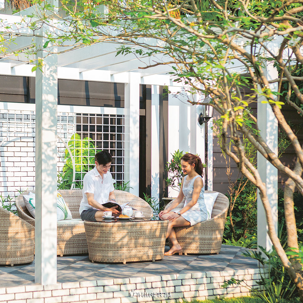 6. ว่ากันว่าธรรมชาติช่วยเยียวยาเราได้เสมอ ตั้งแต่ให้อากาศบริสุทธิ์ในการหายใจ สร้างความสดชื่นทุกครั้งที่ได้มองเห็น และในบางครั้งก็ยังช่วยสร้างความสัมพันธ์อันดีภายในครอบครัวอีกด้วย เหมือนเช่นสวนสไตล์ผสมผสานกันในบ้านจัดสรรสองหลังนี้ ที่มีซุ้มศาลาสีขาวพรางแสงด้านบนด้วยระแนงเหล็กดูแข็งแรง สำหรับให้คนในบ้านได้ออกมาชมสวนในช่วงเช้าและเย็น ในอนาคตยังจะได้ร่มเงาจากต้นจิกน้ำและกันเกรา อีกทั้งโครงของศาลายังสามารถติดหลังคาหรือกั้นเป็นห้องได้ด้วย