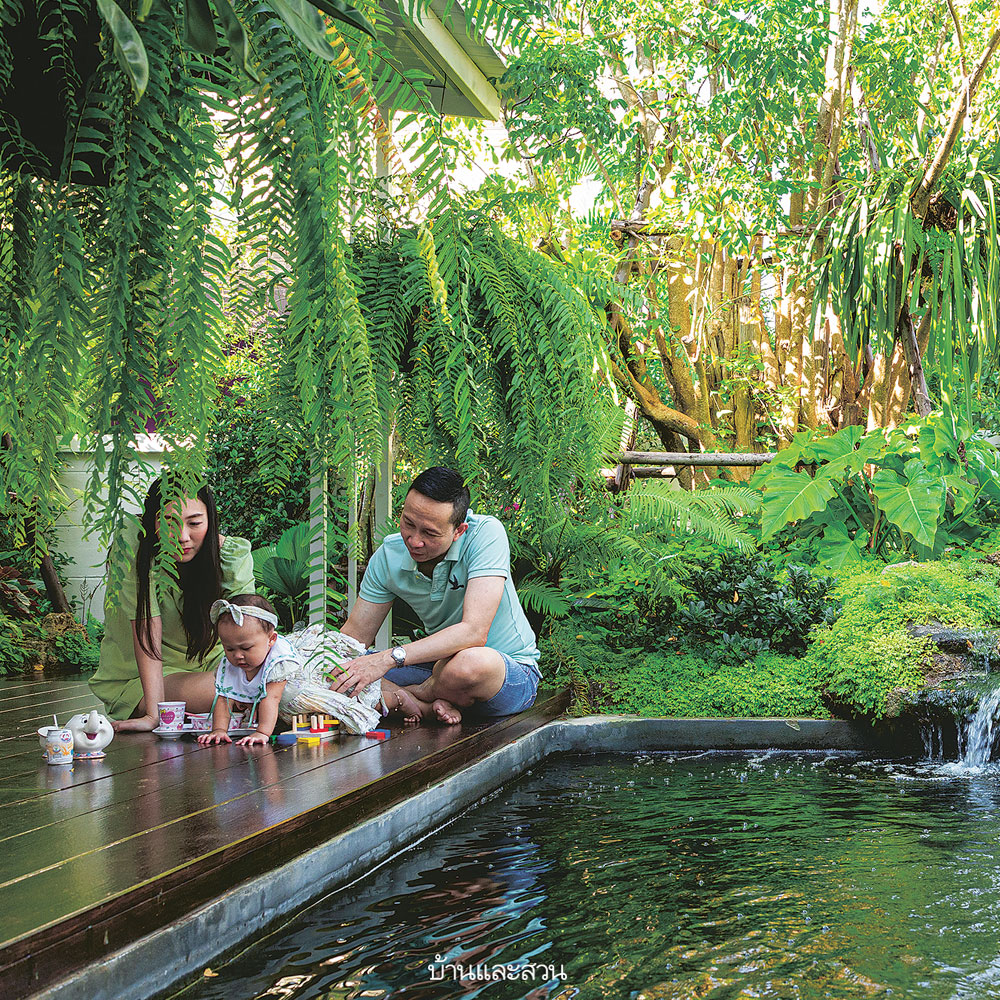 2. ประโยชน์จากสวนสวย ไม่ได้มีเพียงพื้นที่สีเขียวที่ให้ความรู้สึกสบายตาเวลามองเท่านั้น เพราะ ถ้าเพิ่มฟังก์ชันการใช้งานในพื้นที่สวนได้อย่างเหมาะสม สวนยังกลายเป็นห้องพักผ่อนกลางธรรมชาติและห้องกิจกรรมที่ดีของครอบครัวได้ในเวลาเดียวกัน อย่าง ศาลาที่เป็น พื้นที่พักผ่อนสำหรับครอบครัว ซึ่งถูกยกลอยให้เด่นขึ้นจากพื้นประมาณ 20 เซนติเมตร หรือประมาณหนึ่งขั้นบันได อีกทั้งยังมีบ่อปลาคาร์ฟ และชิงช้าให้เด็ก ๆ นั่งเล่นเพลิดเพลิน มองเห็นความเคลื่อนไหวของปลาที่ว่ายไปมาอยู่ในบ่อ พร้อมฟังเสียงน้ำไหล ใต้ร่มเงาของต้นไม้ใหญ่ในสวนแห่งนี้