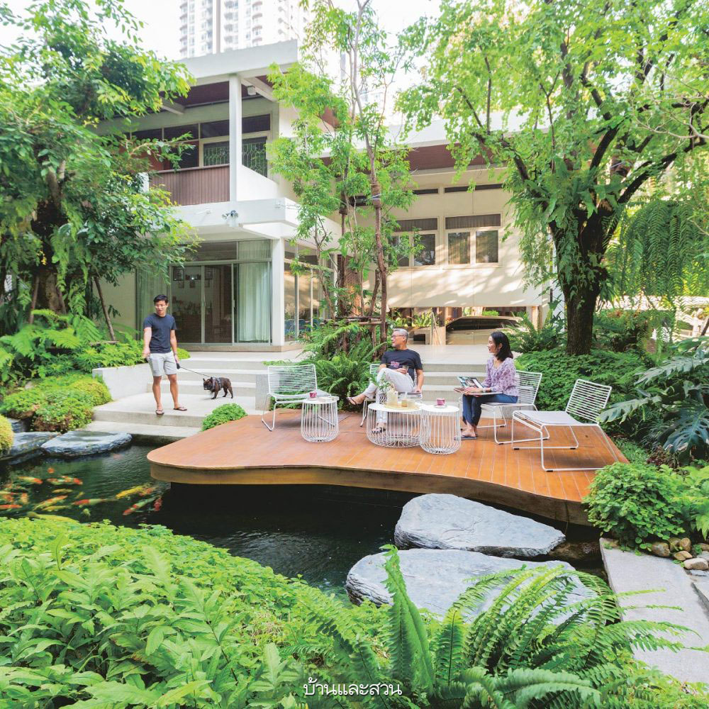1. บ้านเก่าอายุหลายสิบปีกลางสุขุมวิทที่โอบล้อมด้วยตึกสูงรอบด้าน สวนในบ้านบนเนื้อที่เกือบ 400 ตารางเมตร เต็มไปด้วยต้นไม้ที่ร่มรื่น ได้ยินเสียงน้ำไหลจากสวนน้ำตกที่อยู่ด้านใน บ่อปลาขนาดใหญ่ที่มีฝูงปลาคาร์ฟตัวโตแหวกว่ายอย่างมีความสุข ที่นี่เปรียบเหมือนคอร์ตยาร์ดกลางเมืองใหญ่เป็นสวนลับที่ซ่อนไว้ โดยมีเทอร์เรซขนาดใหญ่ยื่นเข้าไปในบ่อ เพื่อให้รู้สึกใกล้ชิดกับสวนมากยิ่งขึ้น ซึ่งโครงสร้างด้านล่างถูกปูด้วยตะแกรงเหล็กกัลวาไนซ์ ก่อนเทปูนทับเพิ่มความแข็งแรง จากนั้นจึงปิดทับด้วยไม้เทียมโทนสีน้ำตาลดูอบอุ่น เป็นที่ซ่อนบ่อกรองของบ่อปลา