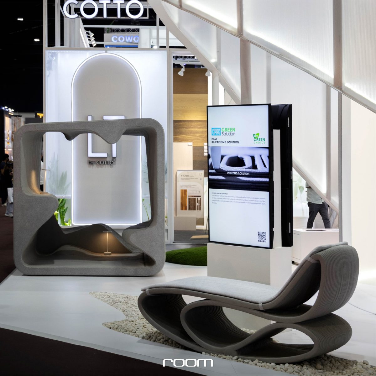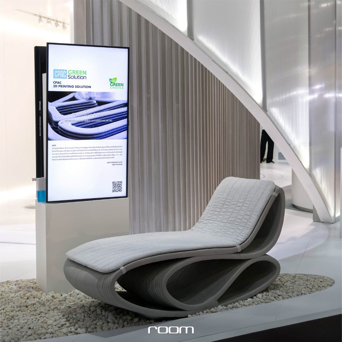 เมื่อเข้าไปด้านในห้องไซส์ XS ที่นำมาจัดแสดง ซึ่งใช้ระยะเวลาในการพิมพ์เพียง 1 วัน ก่อนนำมาติดตั้งบริเวณหน้างานโดยใช้ระยะเวลาเพียง 1 วันเช่นกัน เป็นการลดระยะเวลาการทำงาน ลดการก่อสร้างที่ไม่เหลือ Waste ลดการใช้วัสดุและทรัพยากรได้อย่างคุ้มค่า ผู้ชมจะเห็นเฟอร์นิเจอร์สวยๆ จากวัสดุก่อสร้างเหลือใช้ประดับอยู่ด้วย ซึ่งถือเป็นส่วนหนึ่งในนวัตกรรม Green Construction Solution ที่ช่วยเพิ่มมูลค่าให้กับวัสดุเหลือใช้และลดขยะจากการก่อสร้าง ตามแนวคิด “Turn Waste to Value” ของ CPAC Green Solution