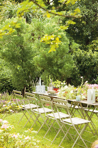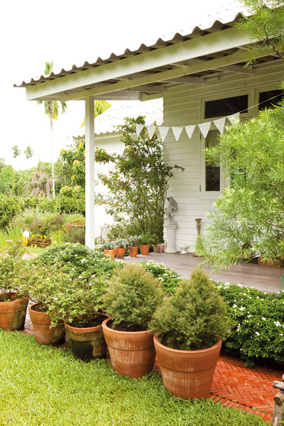 บริเวณสวนเน้นพื้นที่เปิดโล่งรับลม ปลูกต้นไทรจีนทำแนวล้อมรั้วแบบธรรมชาติ แต่ต้องคอยตัดแต่งควบคุมระดับความสูงทรงพุ่มให้อยู่ในระดับสายตา เพื่อให้คนในบ้านยังคงเห็นธรรมชาติโดยรอบได้ ทรงพุ่มแน่นทึบของไทรจีนยังช่วยทำหน้าที่กันฝุ่นละออง และดูดซับเสียงรถที่วิ่งผ่านถนนหน้าบ้านได้เป็นอย่างดี สนามหญ้าหน้าบ้านเป็นสเปซทำกิจกรรมสำหรับเด็ก ๆ