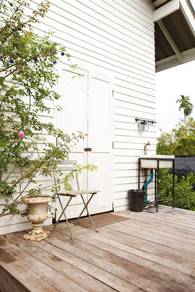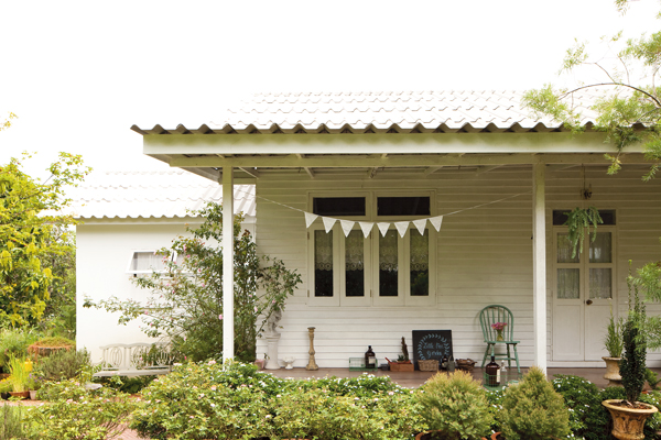 “ หันหน้าเข้าบ้าน ขวามือมีทางลงไปยังบ่อน้ำบรรยากาศธรรมชาติ ตอนเช้าจะเต็มไปด้วยดอกบัวสีชมพูบานสะพรั่ง สามารถเก็บสายบัวมาทำอาหาร และนำน้ำจากบ่อมาใช้รดน้ำต้นไม้ได้ เดินผ่านไปอีกหน่อย เป็นบริเวณทำครัวหลังบ้าน ที่นี่ประกอบอาหารด้วยเตาฟืนแบบดั้งเดิม ทำให้ลูก ๆ ทั้งสองคน น้องปั้น – ด.ช.ธยาน์ และ น้องบุญ – ด.ญ.สาธุ เรืองลอยขำ ได้ซึมซับและเรียนรู้วิธีดำเนินชีวิตในแบบที่พึ่งพาตนเองได้ เมื่อเดินอ้อมผ่านหลังบ้านไปเราจะเจอกับแปลงปลูกกระบะอิฐมอญยกสูง ในนั้นมีทั้งโรสแมรี่ที่ใช้เป็นส่วนประกอบทำขนม พริก ตะไคร้ และผักสลัดอื่น ๆ ที่เพาะกล้าไว้ มุมนี้ตกแต่งด้วยข้าวของแบบสวนอิงลิชคอตเทจ ทั้งเก้าอี้ ชั้นวางของ อุปกรณ์ทำสวน กระถาง และไม้ดอกสีสันที่แทรกอยู่ตามมุมต่าง ๆ ”