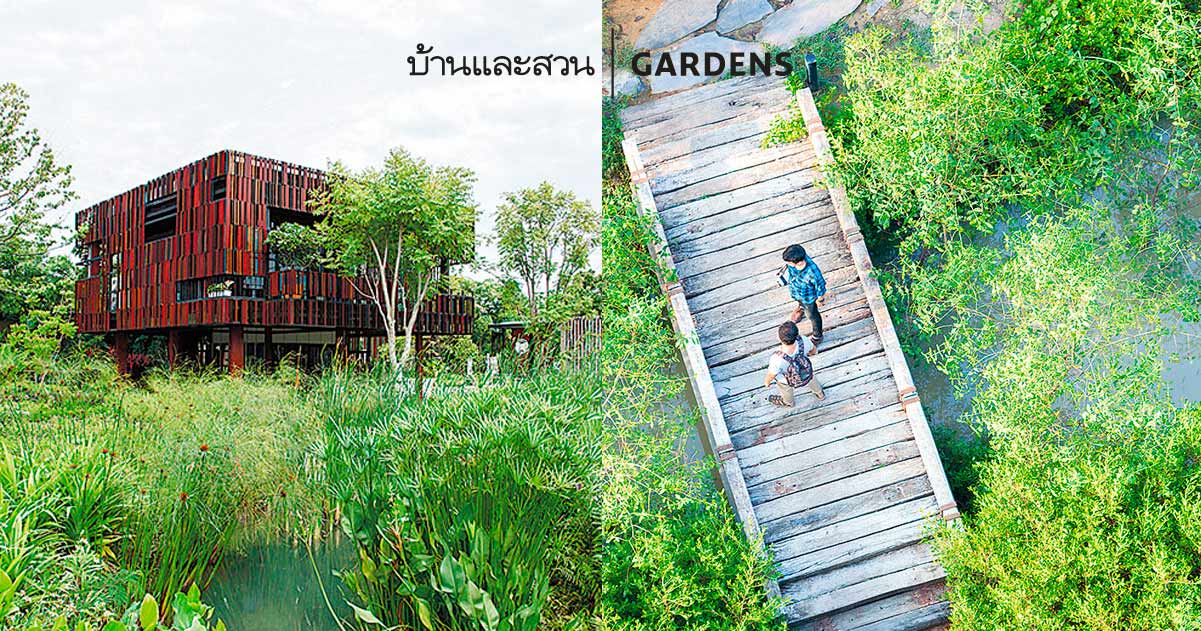 สวนที่เน้นการใช้วัสดุธรรมชาติ อย่าง หลังคามุงจากที่ไม่สะสมความร้อน จึงเย็นสบายและดูเป็นกันเอง อีกทั้งยังมีลูกเล่นอย่างการใช้บานหน้าต่างทำเป็นผนังร้าน เมื่อเปิดขึ้นก็จะกลายเป็นมุมเคาน์เตอร์บาร์ที่มองออกไปเห็นบรรยากาศสวน ตกแต่งด้วยไม้กระถาง และของใช้เก่าที่ดัดแปลงเป็นที่ปลูกต้นไม้