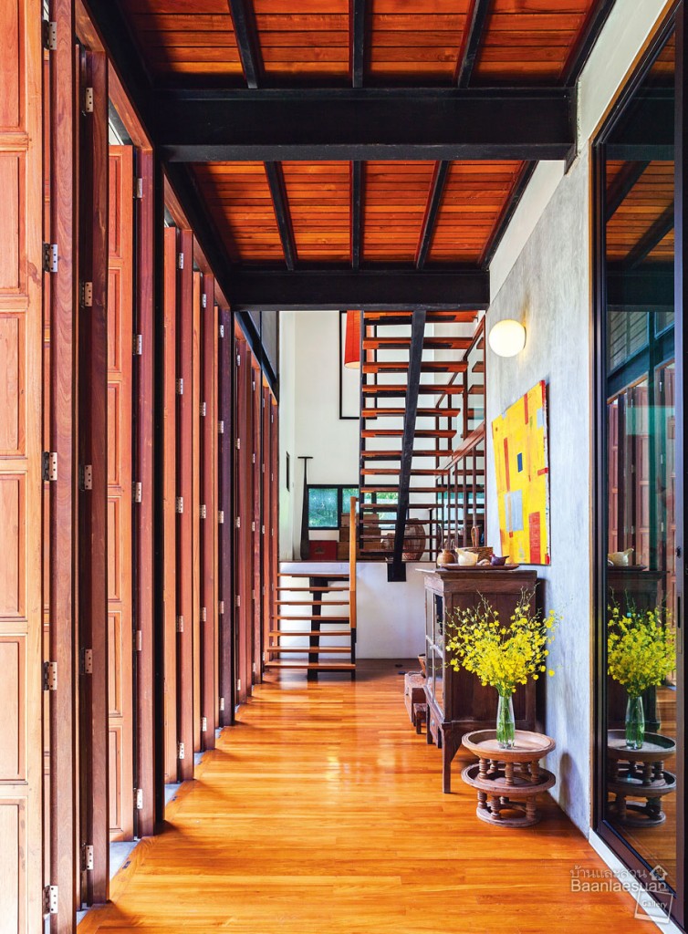 This Thai style home is all about creating one seamless transition from the inside to the outside. Indoors living spaces are light and airy thanks to an array of 26 windows that stand 3.6 meters tall. They open up to bring in the outdoors. The teak wood shutters are the work of master builders from the old capital Ayuthaya. Meanwhile, walls are composed of air blocks. The so-called breathing walls not only promote good air ventilation, but also add to the overall curb appeal.