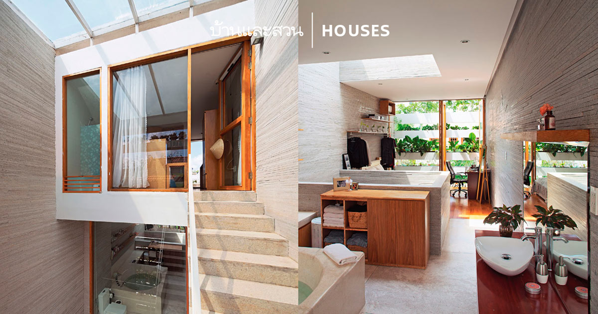 หากมองจากภายนอกบ้านหลังนี้ก็เหมือนบ้านสไตล์โมเดิร์นลอฟต์ ด้วยเพราะผนังส่วนใหญ่เป็นปูนเปลือย แต่พอเงยหน้ากลับเจอหลังคาทรงจั่วแบบไทยที่ปรับให้ดูทันสมัยขึ้น โดยเลือกใช้เมทัลชีท ซึ่งมีน้ำหนักเบากว่าหลังคาทั่วไปและช่วยประหยัดเรื่องโครงสร้างไปได้ แล้วพ่นฉนวนกระดาษไว้ด้านใน เพื่อป้องกันความร้อนและดูดซับเสียงรบกวนจากภายนอก ทั้งยังใช้โปรแกรมการคำนวณองศาของหลังคาให้เลี่ยงการซัดสาดของฝน เพิ่มชายคาที่กั้นแนวแสงแดดไม่ให้เข้ามาในบ้าน แถมหลังคายังช่วยดักลมให้พัดผ่านเพิ่มความเย็นสบายตามธรรมชาติ ขณะเดียวกันก็ยกพื้นบ้านให้สูงจากพื้นเพื่อให้เกิดช่องอากาศถ่ายเท คลายความอับทึบและเป็นช่องทางสำหรับการดูแลซ่อมแซมระบบที่ซ่อนอยู่ใต้บ้านไปด้วย เมื่อมองเข้าไปภายในก็ยังดูเป็นบ้านที่แสนเรียบโล่งแบบมินิมัล แต่ฟังก์ชันทุกพื้นที่ในบ้านตอบรับการใช้งานได้ดีที่สุด >> อ่านต่อ