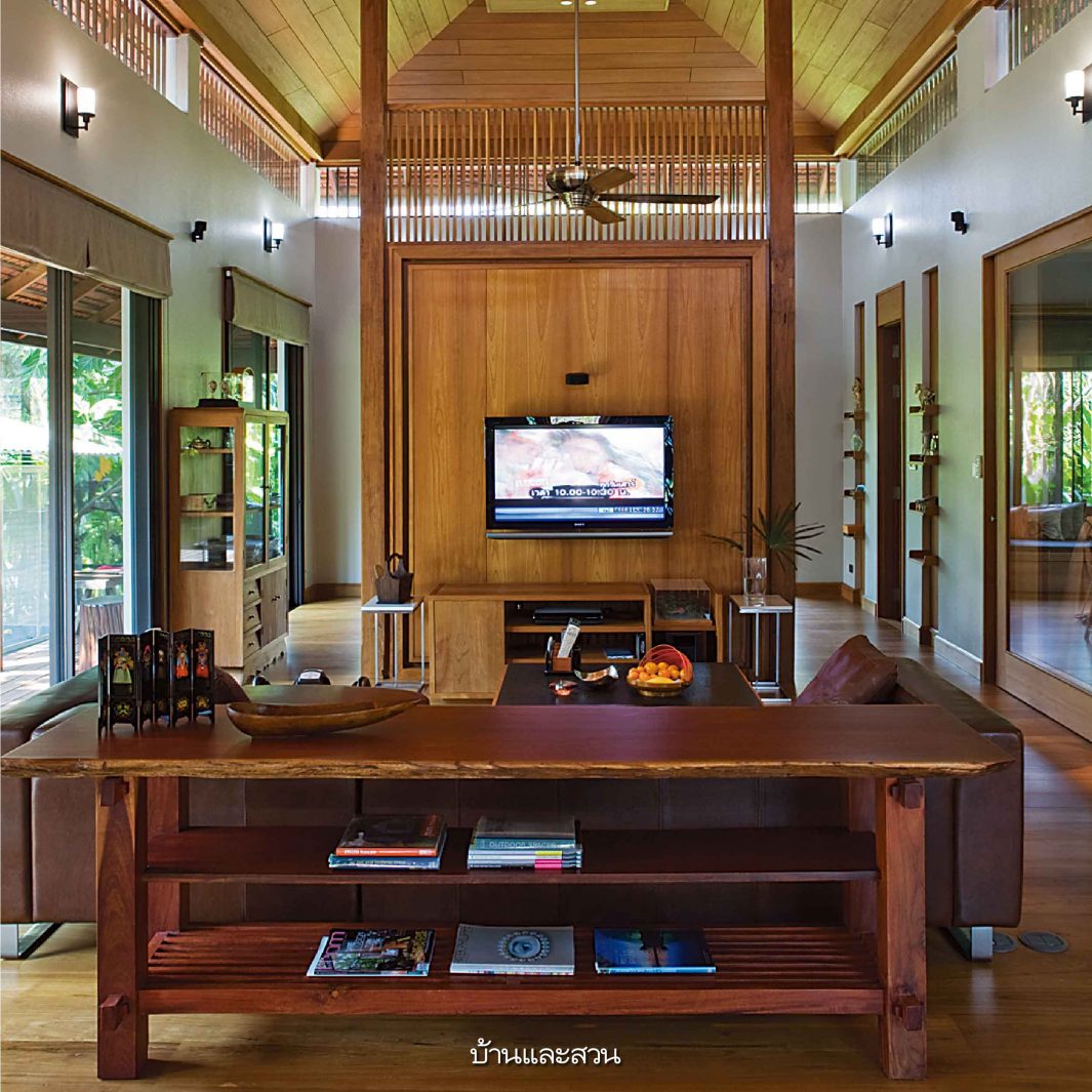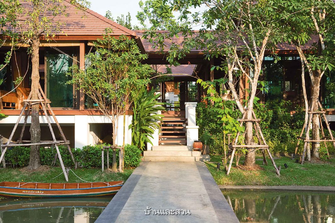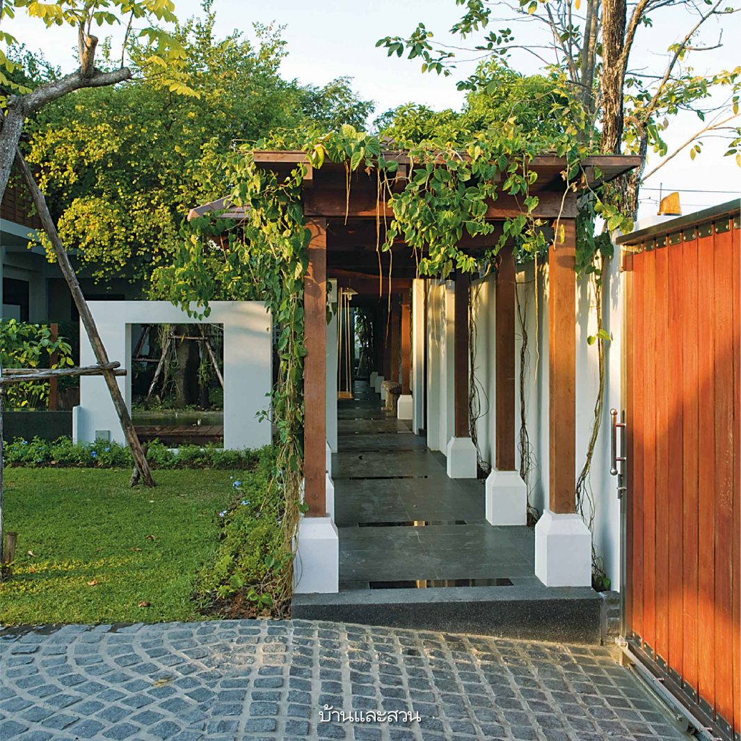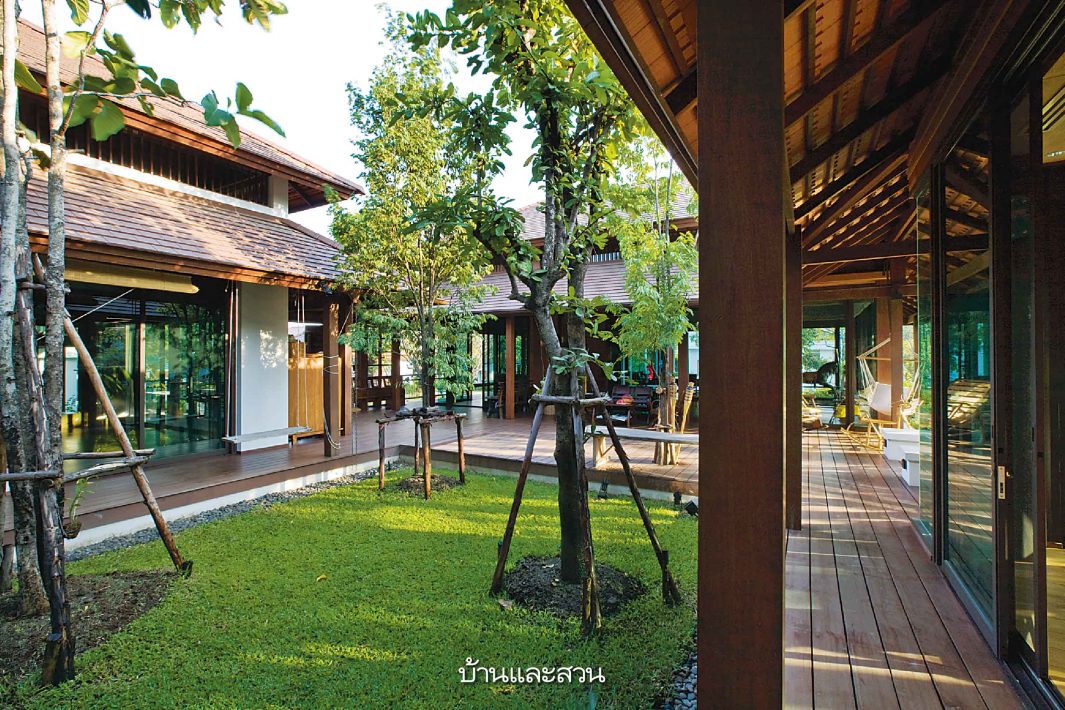บ้านโมเดิร์นซึ่งมีกลิ่นอายความเป็นไทยอยู่ในทุกส่วนของบ้าน ไม่ว่าจะเป็นการใช้ชานขนาดใหญ่เป็นส่วนเชื่อมห้องต่างๆเข้าด้วยกัน หรือการมีสวนกลางบ้านซึ่งเป็นทั้งส่วนพักผ่อนและช่วยให้บ้านร่มรื่นเย็นสบายขึ้น ทั้งยังใช้เป็นพื้นที่เชื่อมต่อสำหรับพบปะกันของคนในบ้านและญาติพี่น้องที่อยู่บ้านใกล้เคียงกันได้ด้วย