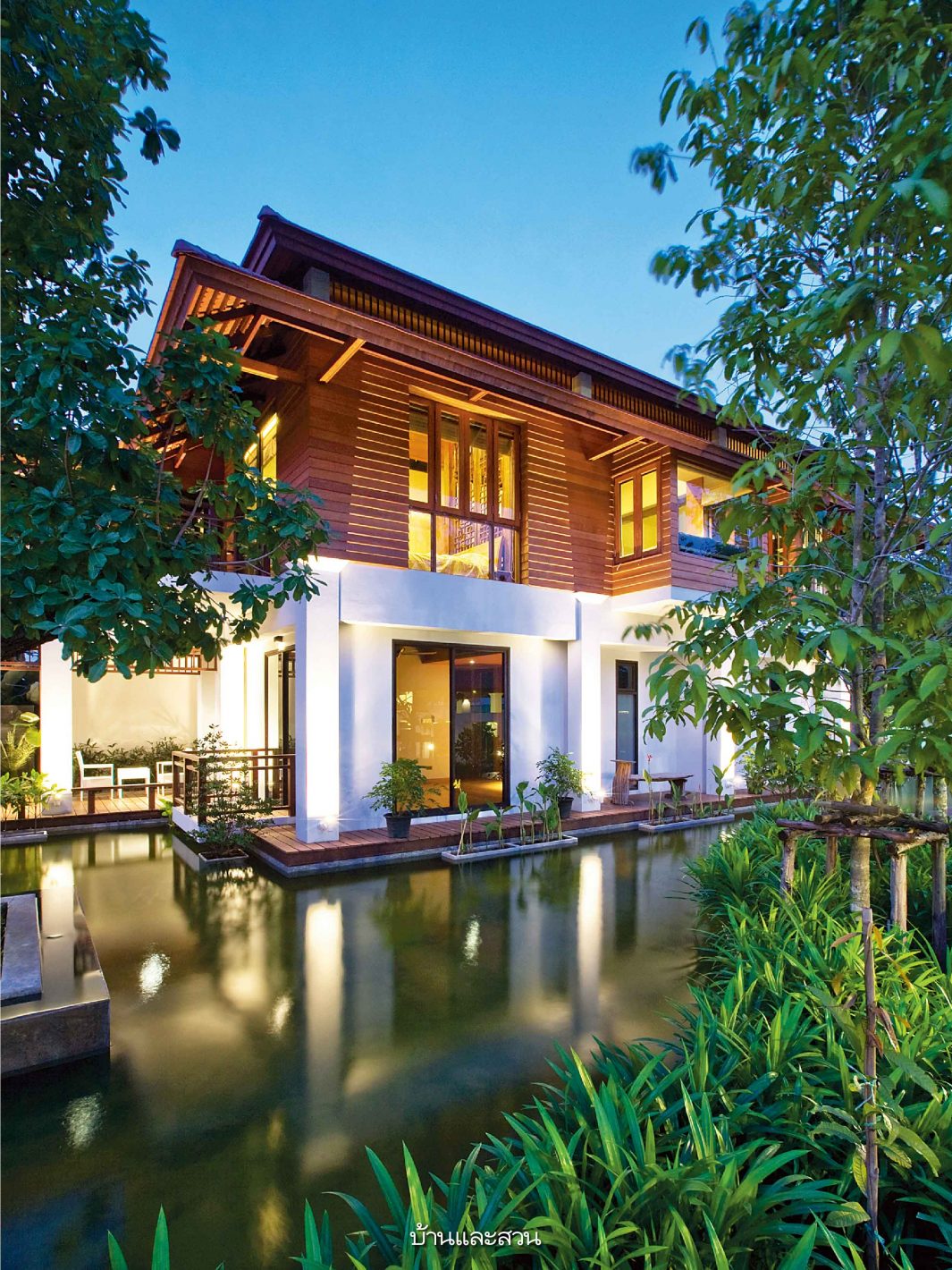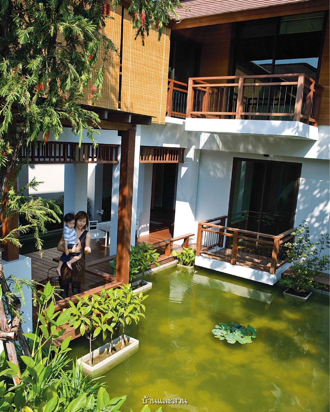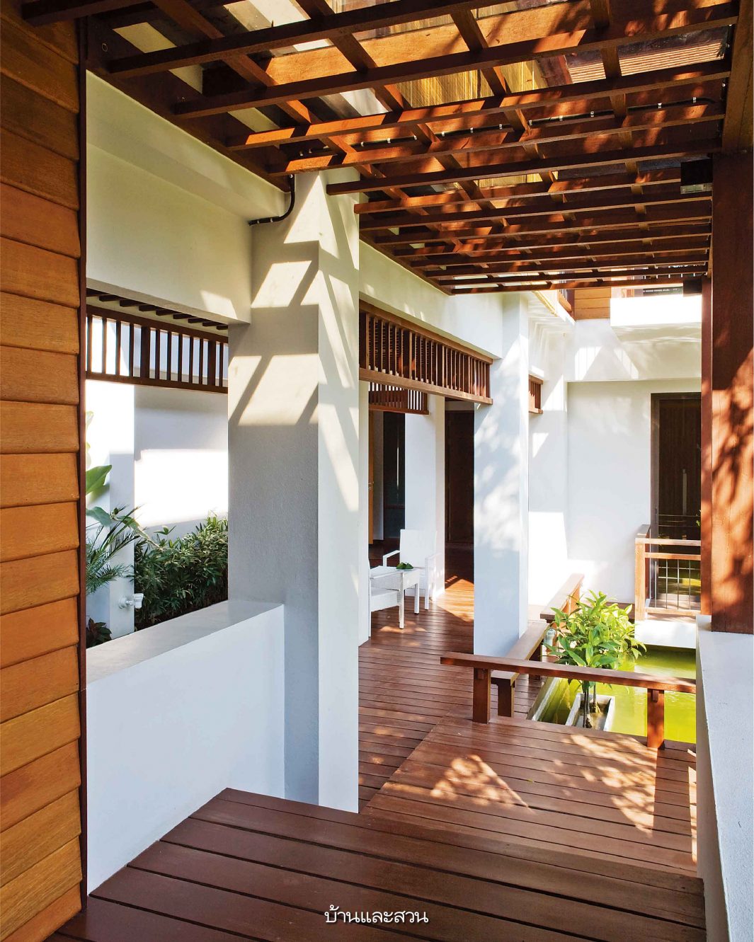 บ้านโมเดิร์นซึ่งมีกลิ่นอายความเป็นไทยอยู่ในทุกส่วนของบ้าน ไม่ว่าจะเป็นการใช้ชานขนาดใหญ่เป็นส่วนเชื่อมห้องต่างๆเข้าด้วยกัน หรือการมีสวนกลางบ้านซึ่งเป็นทั้งส่วนพักผ่อนและช่วยให้บ้านร่มรื่นเย็นสบายขึ้น ทั้งยังใช้เป็นพื้นที่เชื่อมต่อสำหรับพบปะกันของคนในบ้านและญาติพี่น้องที่อยู่บ้านใกล้เคียงกันได้ด้วย