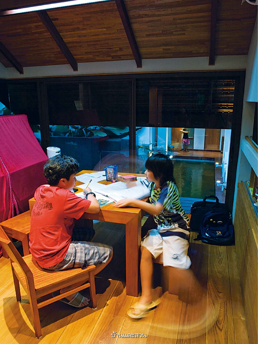 ระหว่างบทสนทนาน้องเติ้งและน้องเต้ ลูกๆของคุณประจวบและคุณดลยพรก็กลับมาจากโรงเรียนพอดี บรรยากาศเริ่มครึกครื้นด้วยเสียงของเด็กๆ ผมคิดในใจว่านี่สินะคือสิ่งที่จะเติมเต็มคำว่า “ครอบครัว” ทั้งคู่ตรงไปยังห้องทำการบ้านที่ชั้นหนึ่ง น้องถามการบ้านพี่ พี่ให้คำแนะนำน้อง ภายในห้องที่ออกแบบให้มองออกไปเห็นบรรยากาศภายนอกบ้านได้ และยังเชื่อมต่อกับห้องนั่งเล่นซึ่งมีพ่อและแม่นั่งดูอยู่อย่างใกล้ชิด![]()