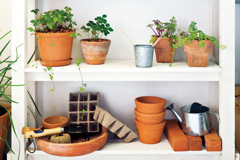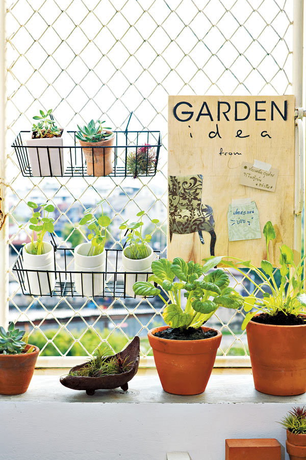การตกแต่งสวนริมระเบียงนี้เน้นคุมโทนสีแบบธรรมชาติ ไม่ว่าจะเป็นชั้นวางของสีขาว การะถางดินเผา หรือจะของตกแต่งชิ้นเล็กชิ้นน้อย จึงทำให้บรรยากาศริมระเบียงรู้สึกผ่อนคลายและสบายตา สำหรับเทคนิคการจัดนั้น ควรเลือกขนาดของกระถางให้สัมพันธ์กันกับตำแหน่งที่ต้องวาง เช่น ชั้นบนสุดควรเลือกไม้กระถางขนาดเล็กเพื่อไม่ให้เกะกะสายตา ส่วนขอบระเบียงวางกระถางขนาดใหญ่ขึ้นเพื่อให้เพียงพอต่อการเจริญเติบโตของผักและทำให้ไม่ล้มง่ายด้วย