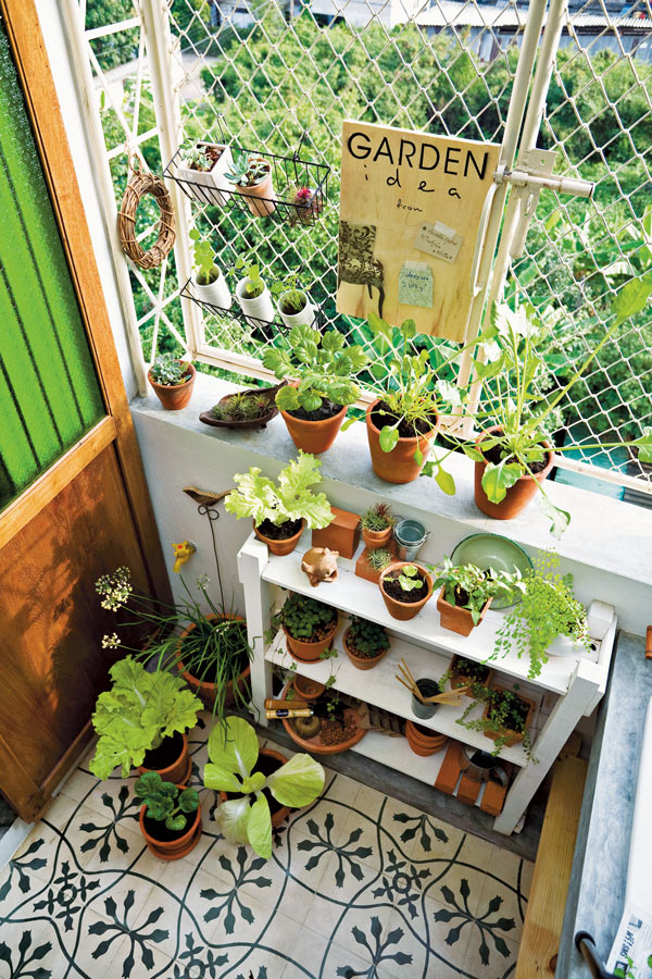 มุม สวนครัว ริมระเบียงขนาดเล็กจัดตกแต่งแบบเรียบง่ายโดยเลือกใช้ชั้นขนาดย่อมวางกระถางต้นไม้และอุปกรณ์ทำสวน เพื่มเติมด้วยกระถางปลูกผักกินใบที่วางบนขอบระเบียงและพื้น ได้แก่ ปวยเล้ง กุยช่าย ผักกาด แสงจันทร์ เป็นต้น สิ่งสำคัญสำหรับการปลูกผักประเภทนี้คือ ควรได้รับแสงแดดอย่างเพียงพอและใส่ปุ๋ยคอกร่วมกับปุ๋ยเคมีบำรุงใบอย่างสม่ำเสมอ