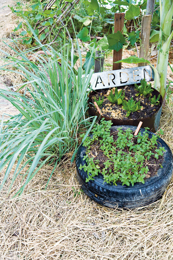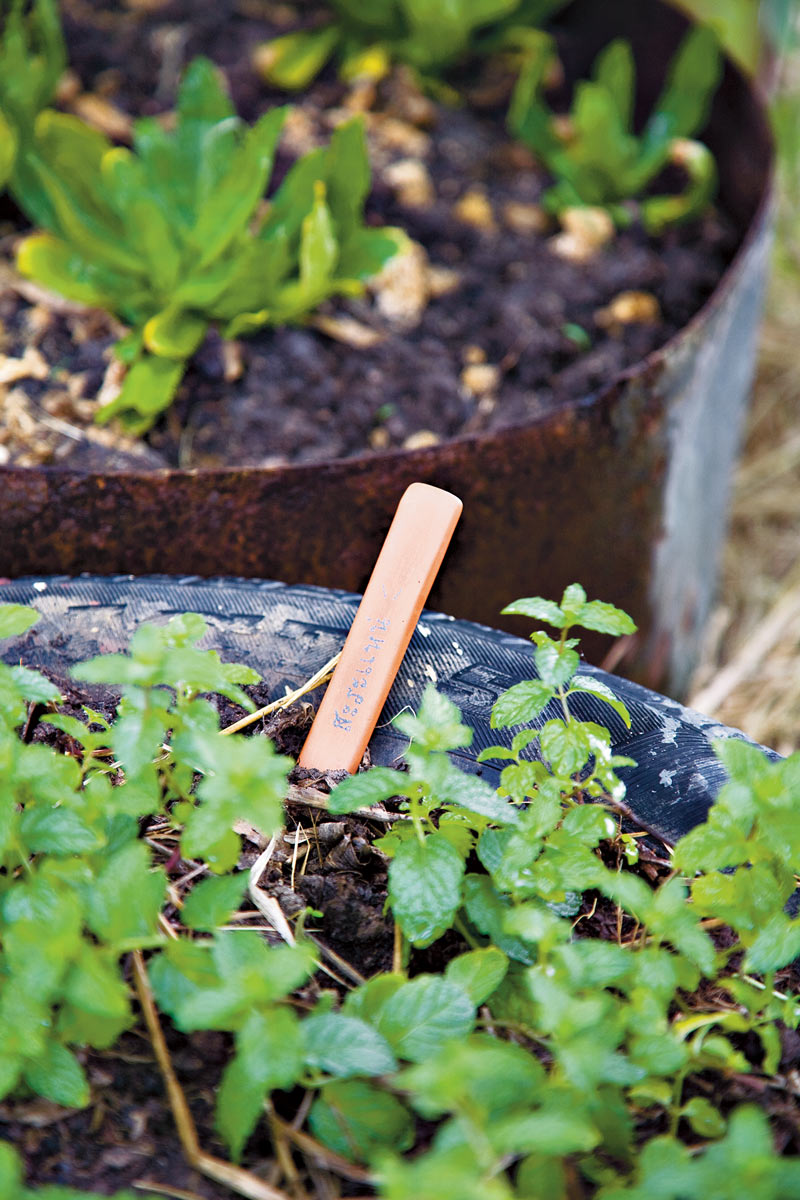พืชผักที่ช่วยแต่งกลิ่นให้อาหารส่วนใหญ่มักจะใช้ในจำนวนเล็กน้อย ลองหาพืชผักเหล่านี้มาปลูกไว้ใกล้ครัวสามารถหยิบฉวยใช้ได้ทันที ก็อาจช่วยให้การทำอาหารสะดวกขึ้นไม่น้อย ตัวอย่างสวนครัวขนาดเล็กมุมนี้มีพืชผักเพียงไม่กี่ชนิด เน้นประเภทที่ใช้งานบ่อย เช่น ตะไคร้ ผักชีฝรั่ง สะระแหน่ ปลูกในถังใบเก่าและยางรถยนต์เหลือใช้ อาจเลือกปลูกผักประเภทที่ทำอาหารเฉพาะอย่าง เช่น ข่า พริก มะกรูด ผักชี โหระพา กะเพรา