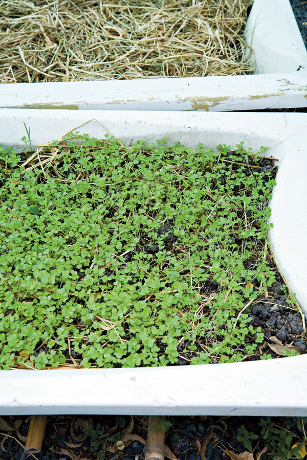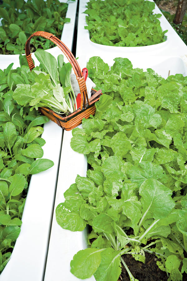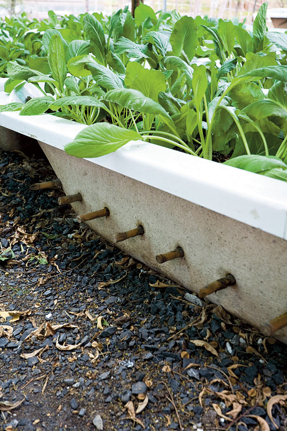- หากภาชนะที่นำมามีก้นลึกมาก แนะนำให้หนุนพื้นขึ้นเพื่อประหยัดวัสดุปลูก ตัวอย่างอ่างอาบน้ำนี้ใช้ไม้ไผ่วางเป็นระยะและปูแผ่นไม้ทับ โดยเหลือความลึกอย่างน้อย 30 เซนติเมตร หากเก็บเกี่ยวผักไปแล้วแต่ละชุด ควรตากดินทิ้งไว้ประมาณหนึ่งสัปดาห์ และใส่ปุ๋ยอินทรีย์เพิ่มธาตุอาหารก่อนปลูกผักชุดใหม่