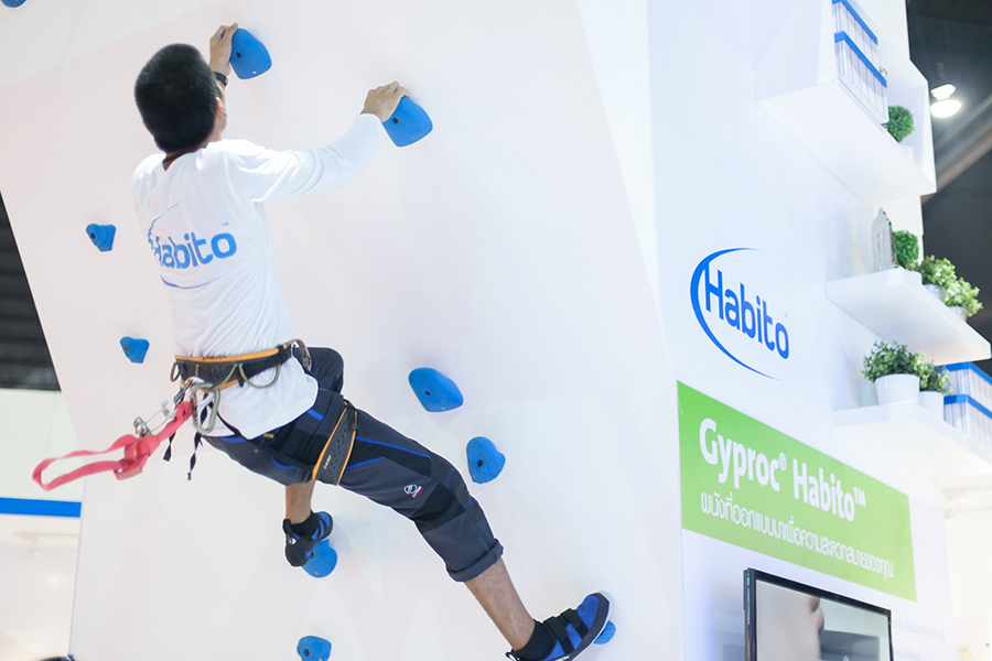 ปิดท้ายกับ บมจ. ไทยผลิตภัณฑ์ยิบซั่ม ผู้ผลิตนวัตกรรมยิปซัมคุณภาพสูงภายใต้แบรนด์ “ยิปรอค” และผู้ให้บริการโซลูชั่นส์ระบบผนังและฝ้าครบวงจร นำเสนอผลิตภัณฑ์และเทคโนโลยีการก่อสร้างภายใต้แนวคิด “Gyproc Fit Your Style” ซึ่งมีทั้งการใช้ผนังยิปซัมบอร์ด แผ่นฝ้าเพดาน ระบบโครงโลหะ ผลิตภัณฑ์ปูนปลาสเตอร์ ฯลฯ โดยมีไฮไลท์คือกำแพงหน้าผาจำลอง (Gyproc Climbing Wall) เพื่อโชว์ประสิทธิภาพการใช้งานและความแข็งแกร่งอันน่าทึ่งของแผ่นยิปซัม ยิปรอค ฮาบิโต้ (Gyproc Habito) สามารถรับน้ำหนักของการปีนป่ายได้อย่างน่าทึ่ง ติดตั้งง่าย โดยเจาะ ยึด หรือแขวนสิ่งของบนผนัง ใช้เพียงสกรูไม้เบอร์ 10 และรับน้ำหนักวัสดุได้อย่างปลอดภัยถึง 15 กิโลกรัม (ต่อจุด) พร้อมคุณสมบัติป้องกันการกระแทก และป้องกันเสียงได้ดี นอกจากนี้ยังมี ปูนยิปรอค แม็กเนติค (Gyproc Magnetic Plaster) ปูนฉาบตกแต่งภายในสูตรพิเศษที่ทำให้ผนังทั่วไป สามารถยึดเกาะกับแถบแม่เหล็กได้ อีกทั้งช่วยปกปิดรอยแตกร้าวได้เป็นอย่างดี ช่วยให้ผู้อยู่อาศัยสามารถสร้างสรรค์ไอเดียในการตกแต่งบ้าน และเพิ่มฟังก์ชั่นการใช้งานในแบบฉบับที่ไม่เหมือนใคร