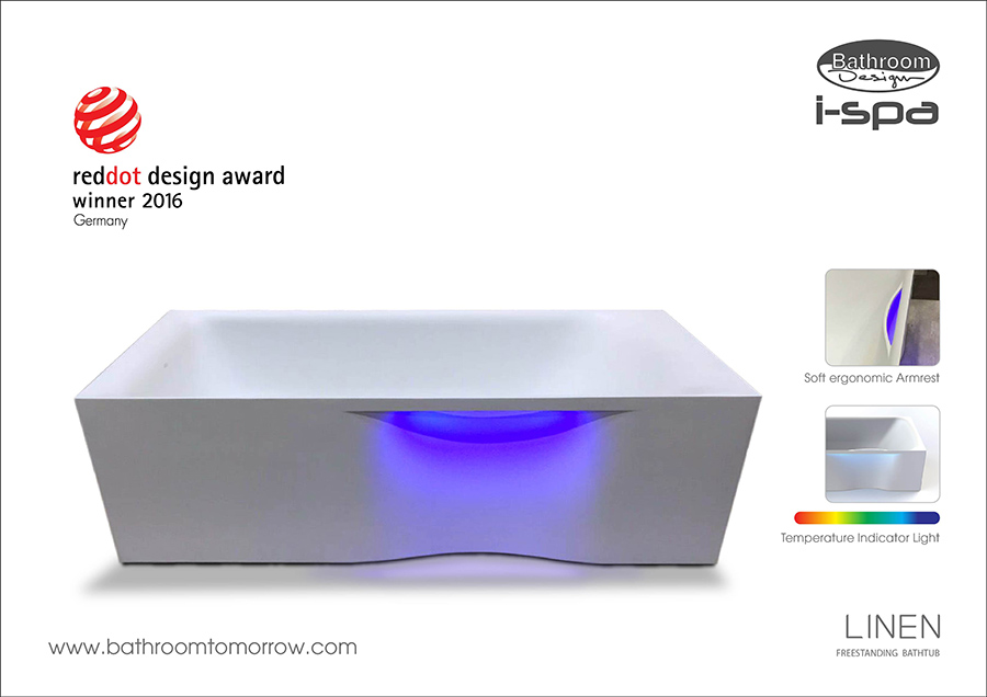 Linen (ลินิน) อ่างอาบน้ำฟรีสแตนด์ใบแรกในโลกที่สามารถแสดงสถานะอุณหภูมิน้ำ โดยเรืองแสงบนผิวอ่างอาบน้ำ ได้รับแรงบันดาลใจจากการเคลื่อนไหวของเนื้อผ้าที่บางเบา จนเกิดเป็นรูปทรงและพื้นผิวของอ่างที่ดูเรียบง่ายแต่แฝงไว้ด้วยพลัง และคำนึงถึงความปลอดภัยสูงสุดด้วยพื้นผิวภายในอ่างที่มีลักษณะคล้ายกับพื้นทราย ช่วยป้องกันการลื่น