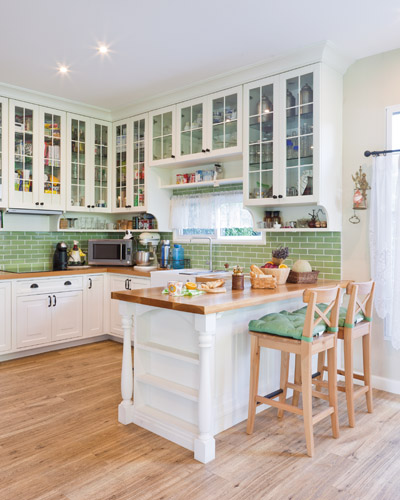 ครัวสไตล์คันทรี่ ครัวนี้เหมาะสำหรับครัวที่ไม่ได้ใช้งานจริงจัง ใช้เตรียมอาหาร (แพนทรี) โดยตกแต่งในโทนสีขาว สีเขียวพาสเทล และไม้ธรรมชาติ เพิ่มกลิ่นอายความคลาสสิกด้วยการติดตั้งตู้บิลท์อิน โดยออกแบบหน้าบานด้วยกระจก และเติมลวดลวยของลูกฟักหรือคิ้วที่ขอบบานช่วยให้ดูมีมิติ และน่าสนใจ