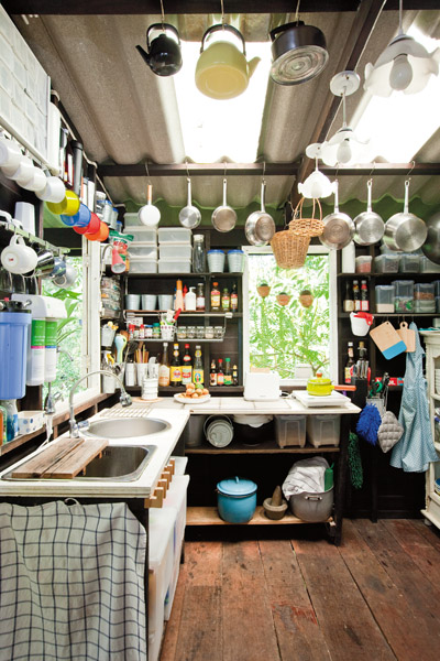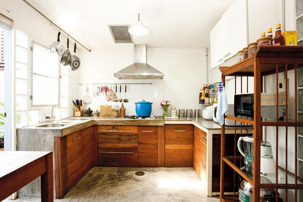 ครัวไทยเปิดโล่ง ตกแต่งด้วยเคาน์เตอร์รูปตัวแอล เคาท์เตอร์ที่ดัดแปลงมาจากไม้เก่า มีช่องหน้าต่างบานใหญ่จึงช่วยระบายอากาศได้ง่าย พร้อมกับหลังคากระเบื้องลอนใส ทำให้มีแสงสว่างที่เพียงพอในระหว่างการทำครัว และด้วยขนาดที่มีจำกัด การจัดเก็บเครื่องครัว เครื่องใช้ไม้สอยต่างๆ จึงควรจัดเก็บอย่างเป็นระเบียบ ขึ้นผนังช่วยประหยัดพื้นที่ อันไหนแขวนได้ก็ยิ่งดี