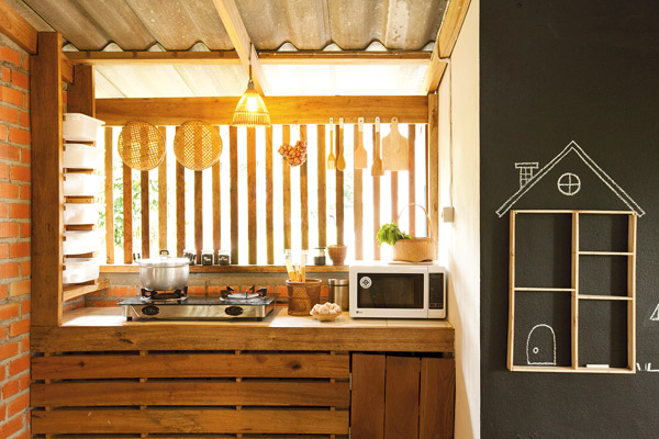 ครัวไทยดีไซน์เก๋ๆ ทำจากไม้เหลือใช้ อย่างการออกแบบหน้าบานของเคาน์เตอร์ด้วยการตีเว้นร่อง เพื่อซ่อนเก็บถังแก๊ส รวมไปถึงทำเป็นระแนงช่องแสง เพื่อรับแสงธรรมชาติและระบายอากาศได้อย่างเต็มที่