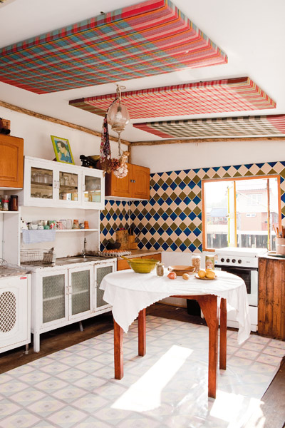 จากตัวอย่างเป็นครัวรูปตัวแอล L ผนังกรุกระเบื้องเคลือบหลากสี ใส่ไอเดียเก๋ๆ ด้วยการนำผ้าขาวม้ากรุบนโครงไม้ และนำมาตกแต่งฝ้า ช่วยเพิ่มมิติให้กับห้องครัวได้เป็นอย่างดี แถมยังมีกลิ่นอายแบบไทยๆ สุดท้ายลองจัดวางด้วยตู้ครัวสีขาวแบบโบราณ ก็ดูเข้ากันลงตัว