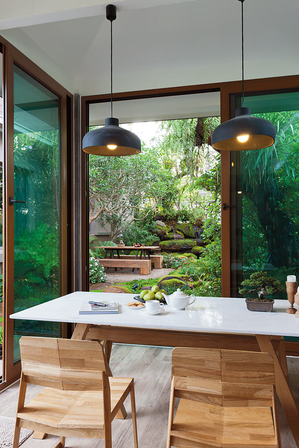 - ด้วยความที่บ้านของผมค่อนข้างร่ม จึงปลูกไม้ใบเป็นหลัก ซึ่งการปลูกไม้ใบร่วมกันให้ได้ความสวยงาม ควรใช้ผิวสัมผัสและขนาดของทรงใบให้ดูแตกต่างกัน เช่น มุมริมกำแพงนี้ ต้นหลักคือจั๋ง ซึ่งใบใหญ่เป็นพิเศษ ไม้พุ่มที่อยู่รายรอบควรมีใบเล็กและหลายรูปทรง ผมเลือกใช้ทั้งฟอร์มที่ดูกลมของบีโกเนีย และฟอร์มที่เป็นเส้นของเล็บครุฑ ช่วยสร้างจังหวะที่ดูไหลลื่น