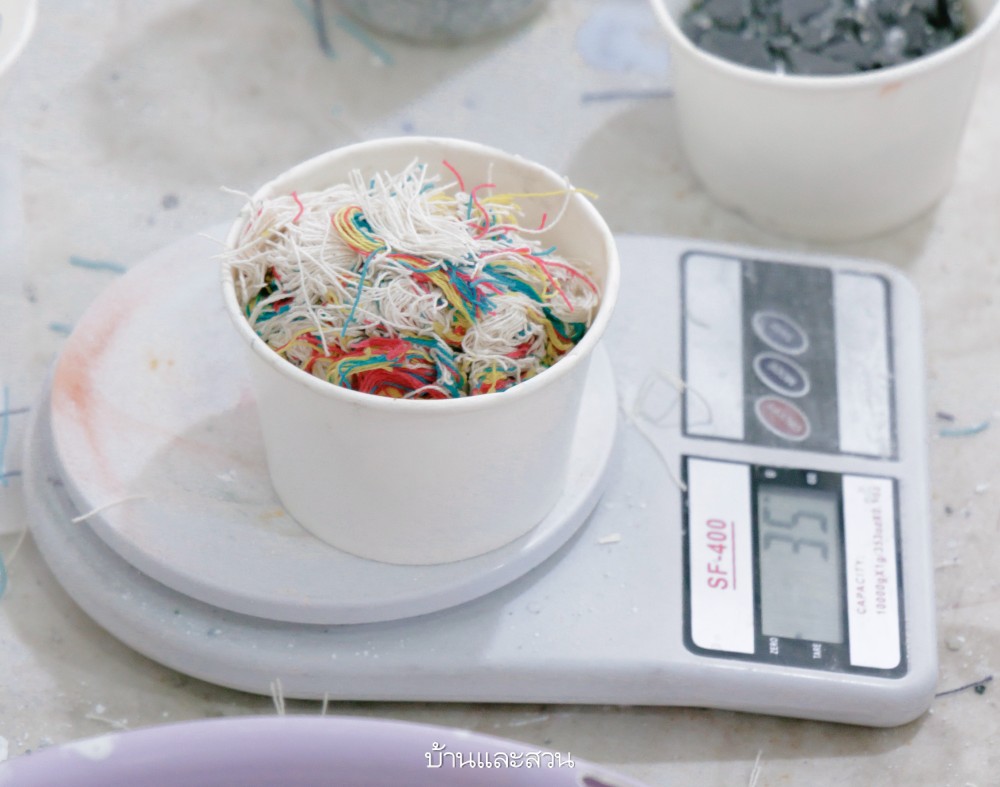 จากเศษฝ้ายที่คัดเลือกโทนสีมาแล้วจาก ดอยตุง จึงส่งต่อมาถึงมือ คุณเอิร์ท-ศตายุ เฉลิมสวัสดิ์วงศ์ นักออกแบบแห่ง สตูดิโอ Humeme เพื่อใช้เป็นส่วนผสมร่วมกับผงปูนและขึ้นรูปให้เป็นโล่รางวัลตามที่ออกแบบไว้ โดยคุณเอิร์ทเล่าถึงขั้นตอนการทำจากนี้ว่า