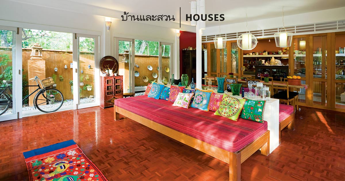 ซึ่งมีทั้งเฟอร์นิเจอร์ไม้สักเก่าและเฟอร์นิเจอร์ดีไซน์ใหม่ๆจากเอสวี เฟอร์นิเจอร์ และ Siamkitsuper ในส่วนของการตกแต่งภายในใช้สีโทนร้อนจัดจ้าแบบตะวันออก เช่น แดง เหลือง ส้ม ทำให้บ้านดูอบอุ่นและมีชีวิตชีวา