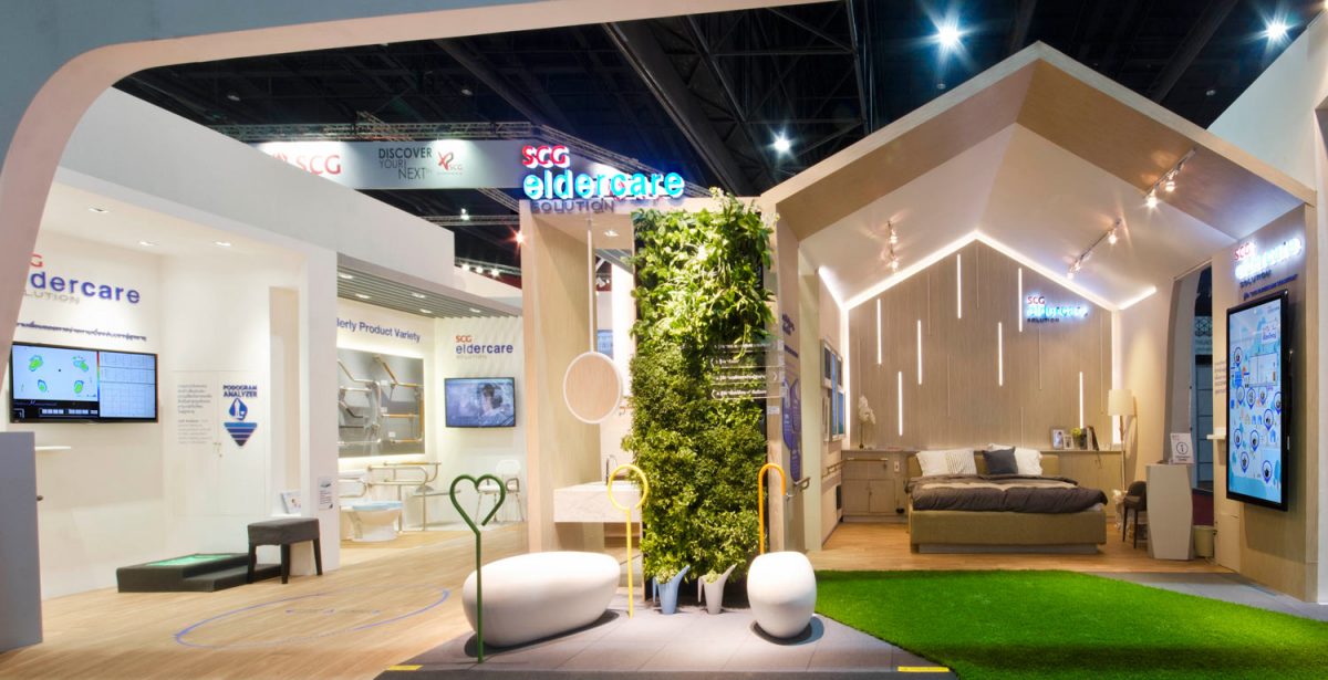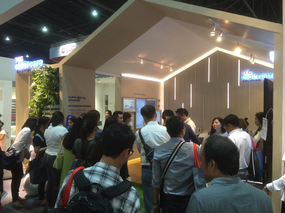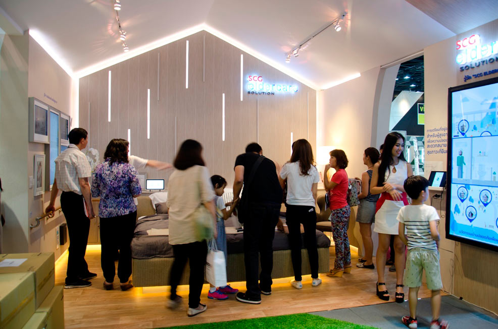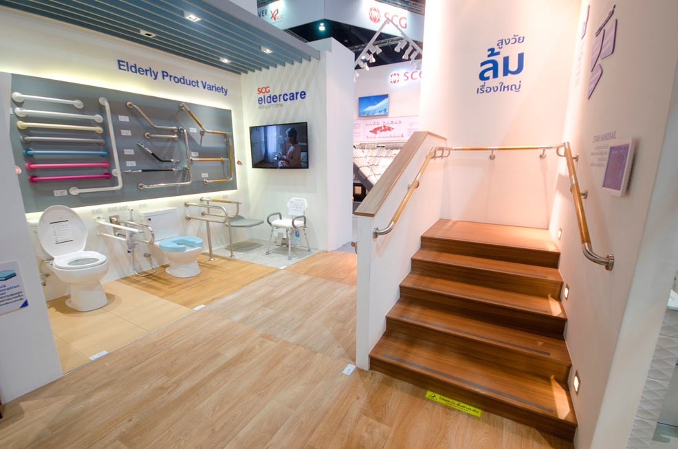 จากงานสถาปนิกสยามที่เพิ่งจบไป บูธ SCG ได้รับความสนใจจากผู้เข้าชมงานอย่างล้นหลาม และโซนที่คนให้ความสนใจเป็นพิเศษจนบูธแน่นขนัดตลอดเวลานั้น ก็คือโซนของ SCG EldercareSolution ซึ่งจัดแสดงบูธภายใต้ธีม “Fall Prevention” ในรูปแบบบ้านทั้งหลัง(Whole House Friendly Elderly Living Environment) โดยได้นำนวัตกรรมที่ทำให้ผู้สูงอายุสามารถทำกิจวัตร ประจำวัน ต่างๆ ภายในบ้านได้อย่างปลอดภัย ช่วยลดความเสี่ยงต่อการลื่นล้มและป้องกันอุบัติเหตุต่างๆ ที่อาจเกิดขึ้น รองรับความเสื่อมถอยของร่างกาย ทั้งในด้านการมองเห็น การได้ยิน การเคลื่อนไหวร่างกาย และความไม่สมดุลของฮอร์โมนและอารมณ์ รวมทั้งให้ผู้สูงอายุสามารถใช้ชีวิตร่วมกับทุกคนในบ้านและสังคมได้อย่างมีความสุข นำมาจัดแสดงให้เห็นจริงทั้งห้องน้ำ ห้องนอน บันได และทางเดินนอกตัวบ้าน ซึ่งเป็นบริเวณที่ผู้สูงอายุมีความเสี่ยงที่จะเกิดการหกล้มมากที่สุด