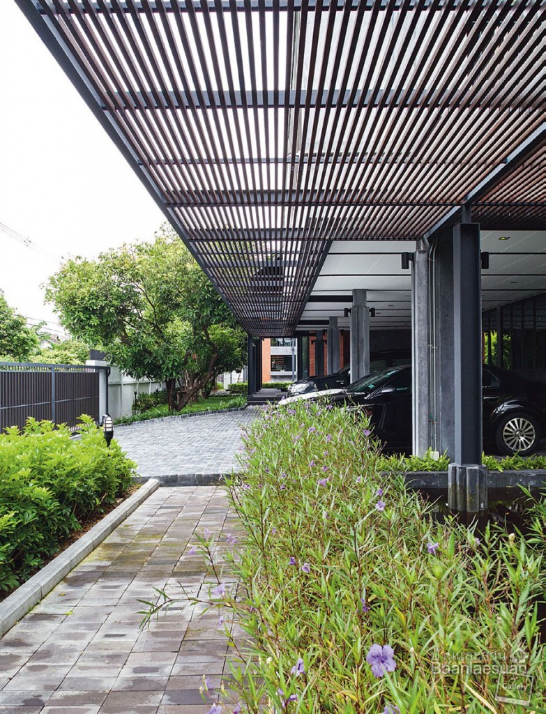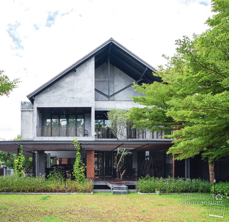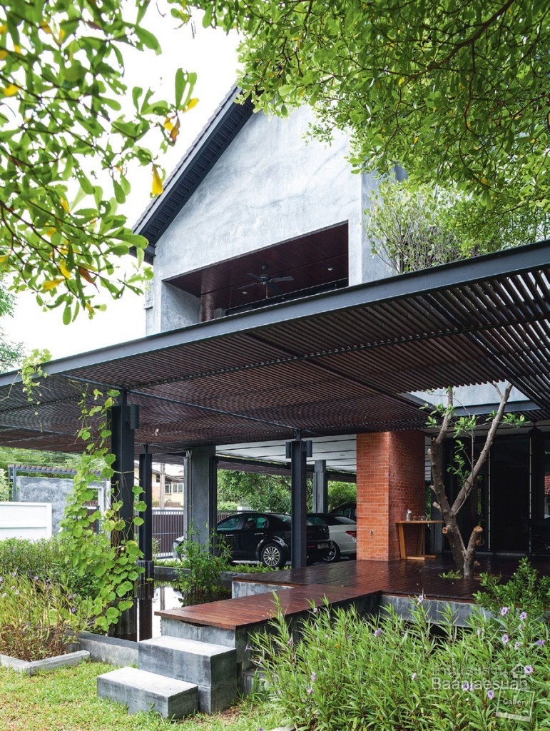 จากของแต่งบ้านที่ผลิตจากสังกะสี ทั้งกระถางต้นไม้ ที่รดน้ำต้นไม้ กล่องเก็บของ ฯลฯ ซึ่งมีรูปแบบดิบเท่ ถ่ายทอดมาสู่รูปแบบของตัวบ้านที่ดูสอดคล้องกัน เป็นบ้านสไตล์โมเดิร์นที่มีกลิ่นอายของงานสถาปัตยกรรมเมืองร้อนอยู่มาก ไม่ว่าจะเป็นหลังคาทรงจั่วสูง ชายคาและกันสาดที่ยื่นยาวบังแดดฝน และความโปร่งสบายแบบไทยๆ ทั้งหมดได้รับการลดทอนให้เหลือเพียงรายละเอียดที่จำเป็น จึงทำให้บ้านหลังนี้ดูทันสมัยและผ่านกาลเวลาได้โดยไม่รู้สึกน่าเบื่อ คุณนุตร์ เชนยะวณิช เจ้าของบ้านและผู้ออกแบบ เล่าว่า