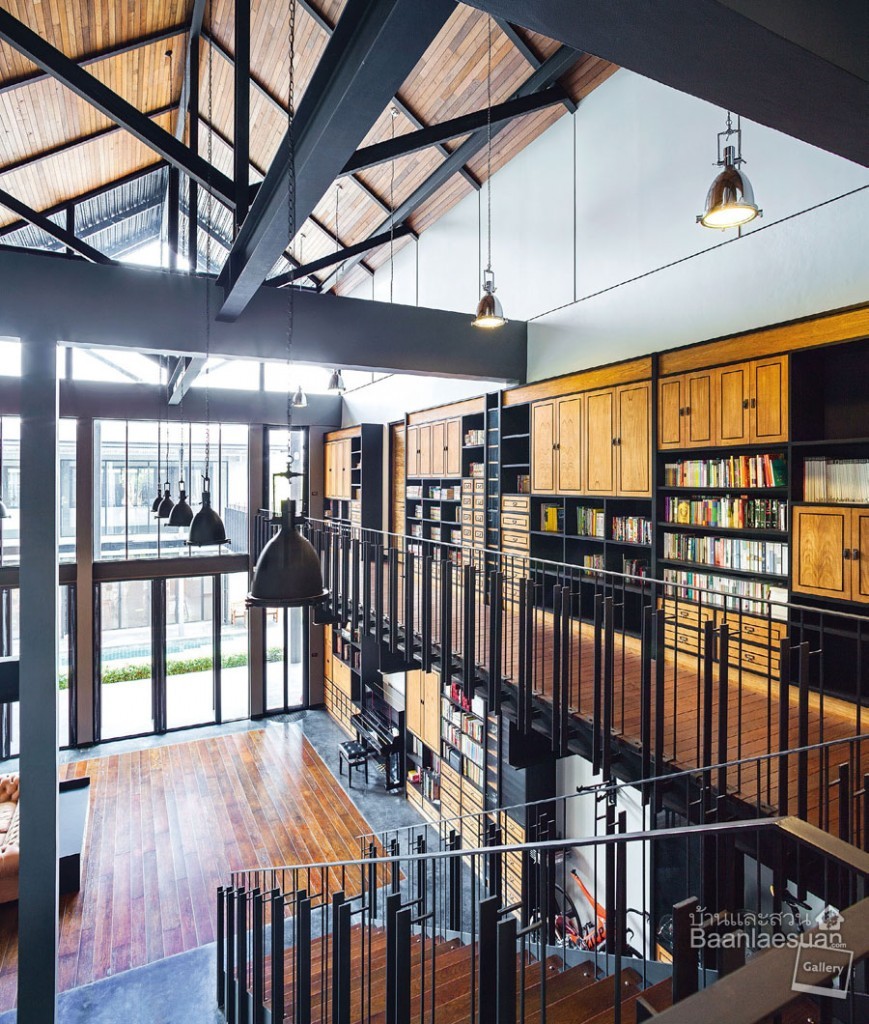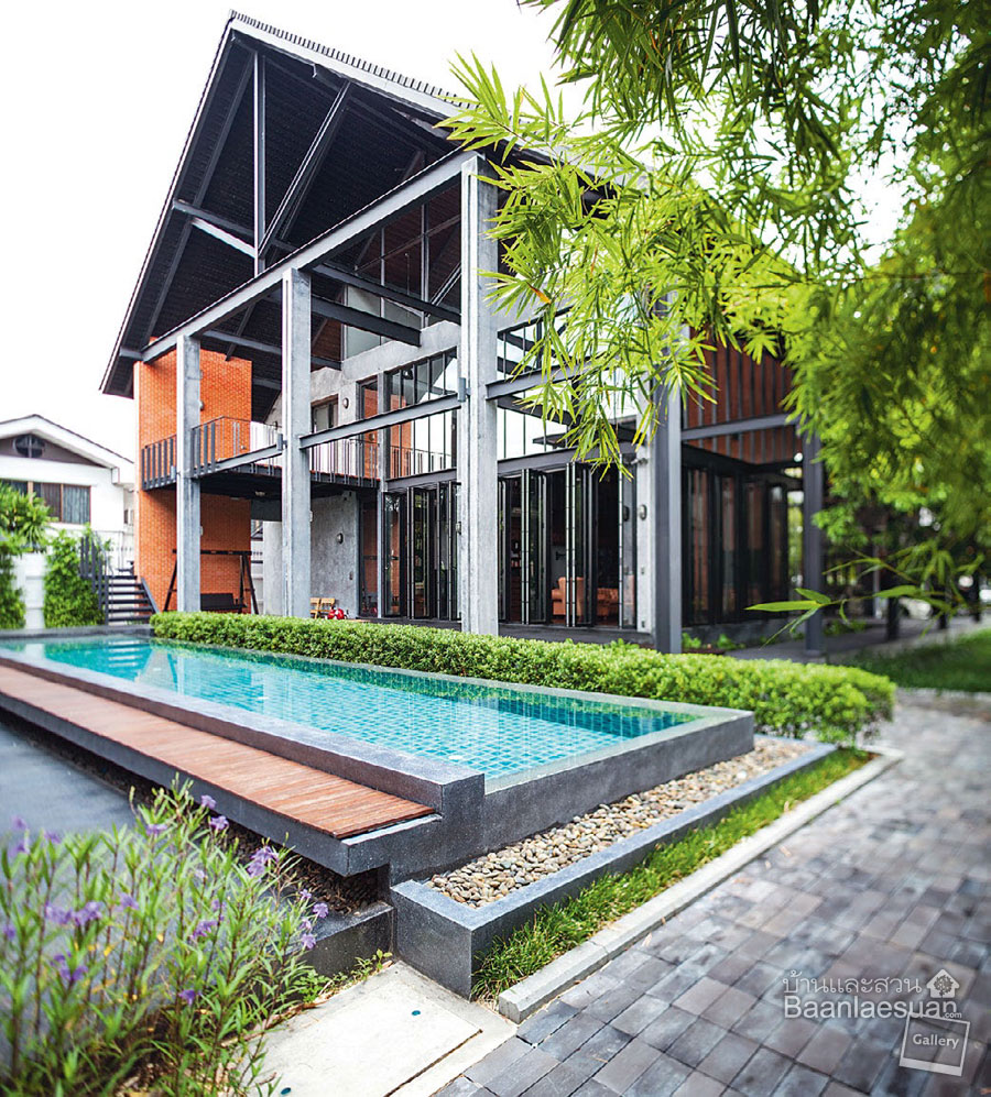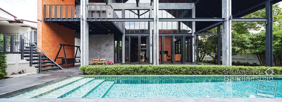 ก่อนจะสร้างบ้านหลังนี้ มีอาคารสำนักงานของ Tin Home Toy ตั้งอยู่ด้านข้างมาก่อน รูปแบบของตัวบ้านถือได้ว่าสอดคล้องกับตัวสำนักงาน เพื่อให้เกิดความเชื่อมโยงกัน ทั้งสองส่วนคั่นด้วยสระว่ายน้ำที่วางตัวยาวกั้นกลางอยู่ วัสดุหลักที่ใช้คือโครงสร้างเหล็ก เพราะเจ้าของบ้านชื่นชอบในความดิบเท่ และยังให้ภาพลักษณ์ที่ดูทันสมัย อีกทั้งโครงสร้างเหล็กรูปพรรณที่นำมาใช้เป็นเสา คาน โครงสร้างพื้น และโครงหลังคา ก็ทำให้การก่อสร้างเป็นไปอย่างรวดเร็วและหน้างานก็สะอาด เมื่อประกอบกับบานกระจกสูงใหญ่สลับกับผนังก่ออิฐโชว์แนว ก็ทำให้บ้านนี้ครบสูตรบ้านเท่แบบดิบๆ