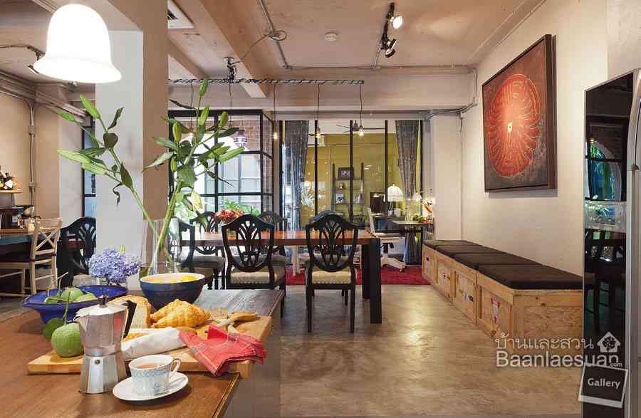 ภายในบ้านออกแบบให้เปิดรับแสงธรรมชาติ พร้อมทำโถงเพดานสูงในบริเวณครัว โดยรื้อพื้นชั้นสองออก เพื่อเปิดให้พื้นที่ดูโปร่งขึ้น บริเวณหลังบ้านจัดเป็นสวนขนาดเล็ก มีหลังคาไวนิลโปร่งแสงคลุมจากชั้นบนสุดของตัวอาคาร จึงได้รับแสงธรรมชาติ นอกจากนี้ยังรื้อผนังบางส่วนของอาคารเดิมออก แล้วสร้างผนังใหม่โดยออกแบบเป็นประตูและหน้าต่างโค้งสไตล์คลาสสิก สร้างบรรยากาศเหมือนห้องชุดสไตล์ลอฟต์ในนิวยอร์ก และโชว์เนื้อแท้ของวัสดุอย่างฝ้าเพดานเปลือย แนวท่อร้อยสายไฟ ผนังบางส่วนก่ออิฐโชว์แนว และไม่ลืมนำความชอบส่วนตัวของเจ้าของบ้านที่ได้เก็บเกี่ยวประสบการณ์จากการ ท่องเที่ยวในต่างแดนมามีส่วนร่วมกับการออกแบบด้วย อย่างการเลือกสีและเฟอร์นิเจอร์ ซึ่งคุณแอนและคุณเวสลงมือออกแบบและทำด้วยตัวเอง