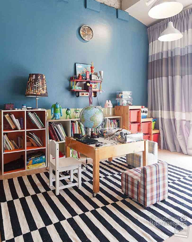 สไตล์ลอฟต์ ไม่จำเป็นต้องมีเพียงสีขาว เทา หรือดำเท่านั้น คุณกฤษฎิ์ณภพเลือกใช้สีอื่นๆเป็นจุดเด่น รวมถึงแบ่งการใช้งานเป็นพื้นที่ส่วนรวมและพื้นที่ส่วนตัว อย่างบริเวณชั้นหนึ่งเป็นพื้นที่ใช้งานร่วมกันระหว่างครัวกับส่วนรับประทาน อาหาร จึงใช้ผนังสีเทาแบบปูนเปลือยตัดกับผนังอิฐสีส้มต่อเนื่องไปจนถึงห้องนั่ง เล่นที่อยู่ชั้นบน สำหรับพื้นที่ส่วนตัวอย่างห้องนอนแขกซึ่งมองเห็นวิวสวนได้ เลือกใช้สีเขียวมะนาวให้ตัดกับกำแพงสีน้ำเงินสดในบริเวณสวนที่อยู่ติดกัน