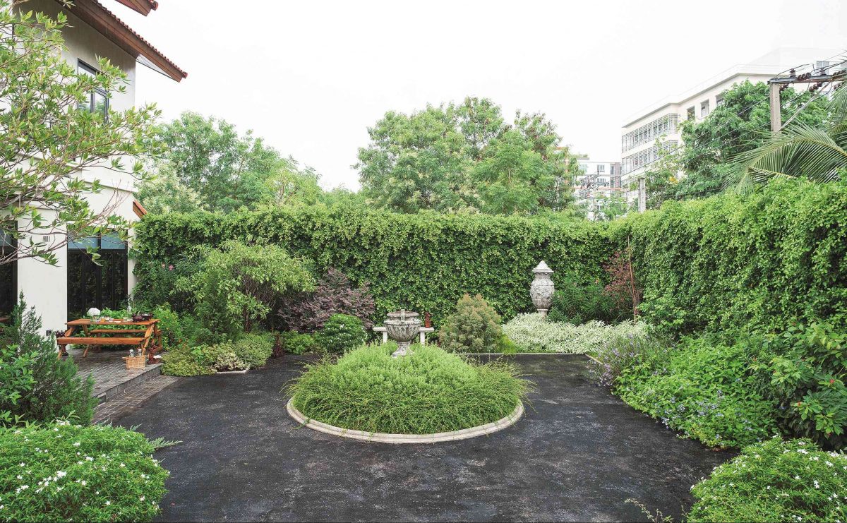 จาก ความต้องการพื้นที่ส่วนตัว กลายมาเป็นสวน ซึ่งเป็นทั้งพื้นที่พักผ่อนของเจ้าของบ้าน ที่มีความเป็นสวนตัวด้วย สวนนี้ มีลักษณะที่ดูเรียบง่าย เส้นสายไม่เยอะ และถูกตกแต่งออกมาในสไตล์กึ่งฟอร์มอลที่มีกลิ่นอายของสวนอังกฤษด้วย อีกด้านนึงของสวนออกแบบเป็นลานเรียบง่ายแวดล้อมด้วยไม้ ใบหลากสีสัน วางของตกแต่งที่มีกลิ่นอายวินเทจ ดูเป็นสไตล์แบบอังกฤษ