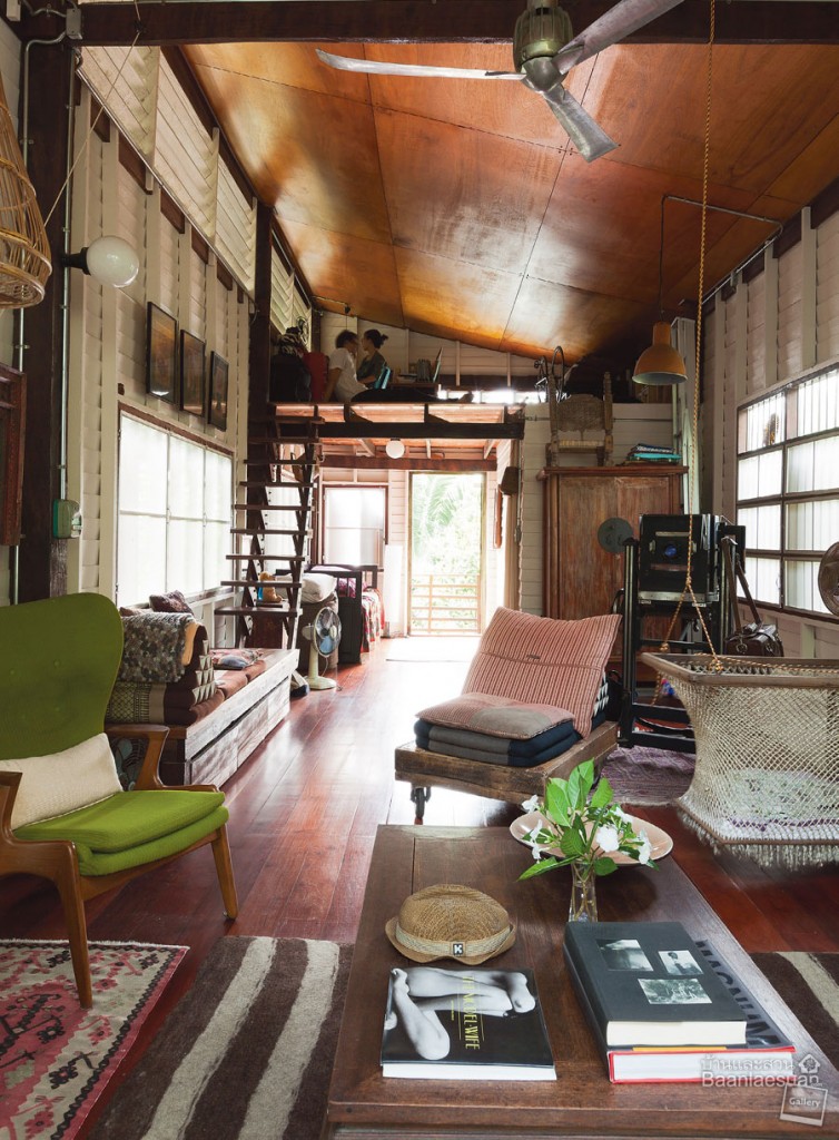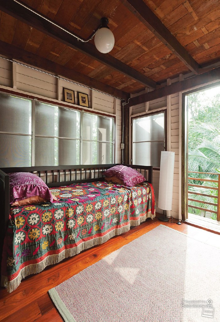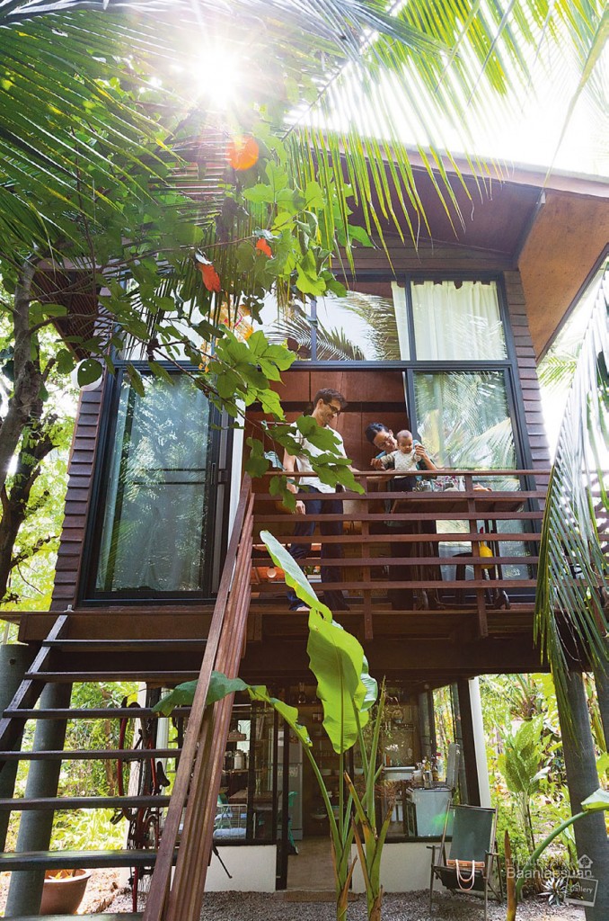 บ้านไม้ใต้ถุนสูง ชั้นบนเปิดโล่งเป็นมุมพักผ่อน ดูโปร่งและสบาย มีชั้นลอยเล็กๆสำหรับใช้เป็นห้องทำงาน ส่วนใต้ถุนกั้นเป็นครัวและด้านหลังเป็นห้องมืดสำหรับงานถ่ายภาพของคุณลองดรีย์ เจ้าของบ้านทั้งสองอยากให้บ้านหลังนี้กลมกลืนไปกับบ้านของเพื่อนบ้าน รวมถึงตั้งใจให้เป็นพื้นที่ที่ได้สัมผัสวัฒนธรรมความเป็นไทย และรบกวนโลกให้น้อยที่สุดเท่าที่จะทำได้ เช่น การใช้น้ำทิ้งจากการล้างจานต่อท่อไปรดน้ำต้นไม้ ไม่ใช้เครื่องปรับอากาศและโทรทัศน์ ทำน้ำร้อนจากแสงอาทิตย์ ทำส้วมแบบไม่ใช้น้ำ แต่ใช้ขี้เลื่อยกลบแทน ใช้ผ้าอ้อมแบบซัก ใช้พาหนะหลักคือจักรยาน และปลูกผักสวนครัวไว้รับประทานเองด้วย คุณน้ำผึ้งเล่าต่อไปว่า