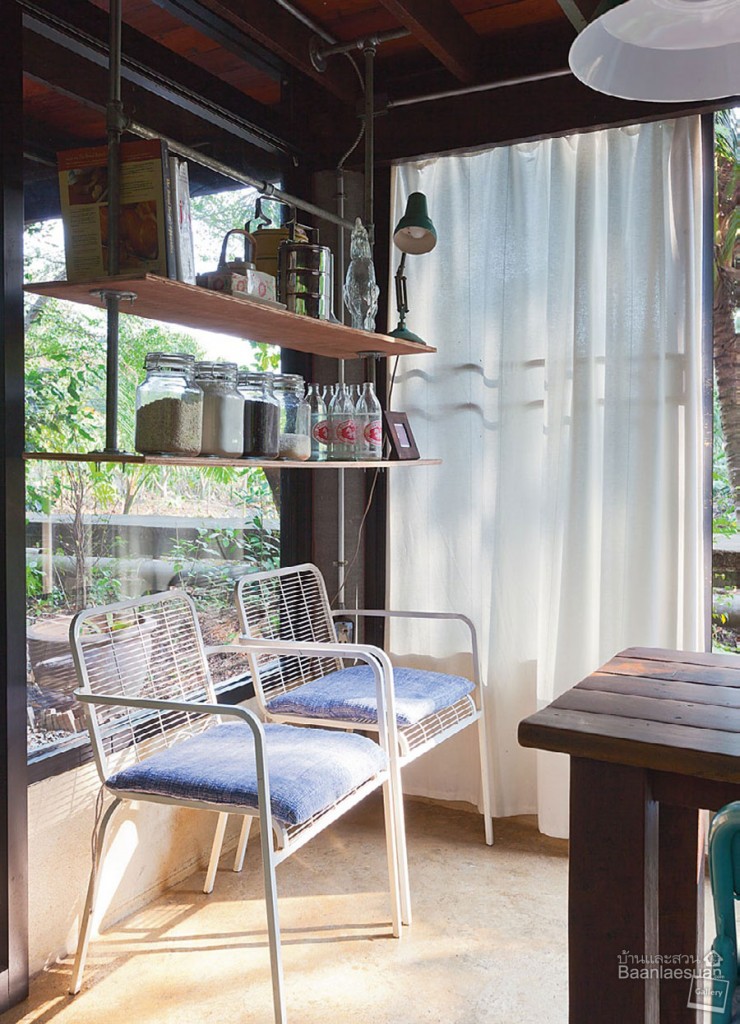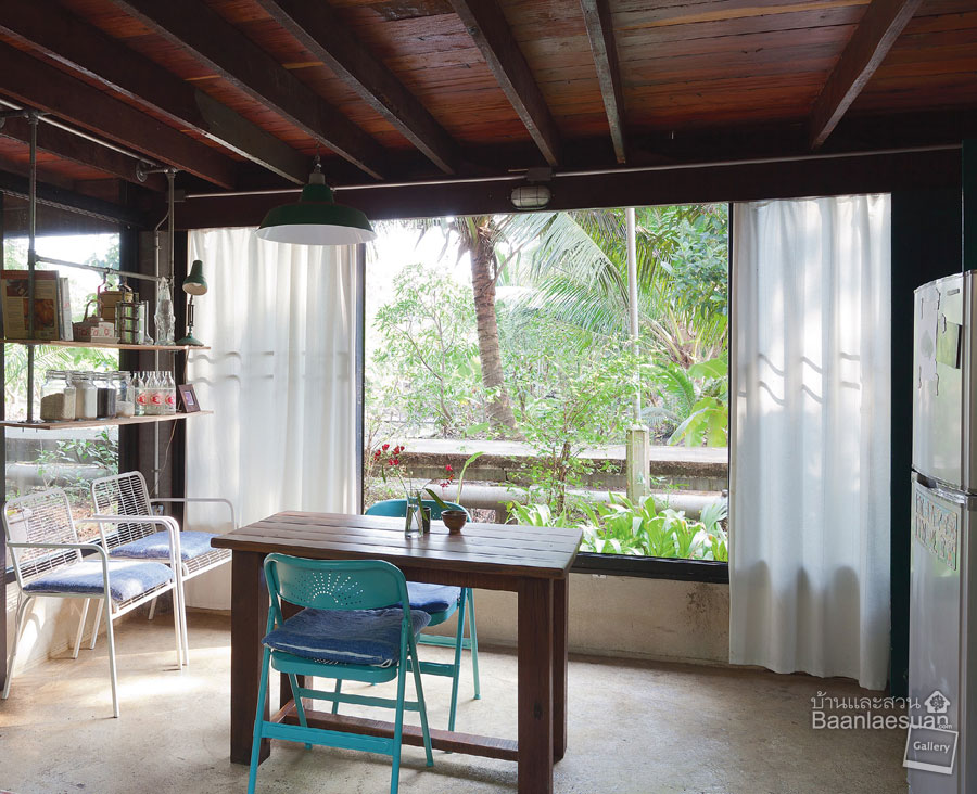 “เราซื้อที่ดินต่อจากเพื่อนบ้าน และเพื่อนบ้านก็เป็นช่างไม้ เขาช่วยเราสร้างบ้านด้วย ตอนออกแบบก็ลองทำโมเดลบ้านก่อน นอกจากนี้ยังมีเพื่อนซึ่งเป็นสถาปนิก (คุณชุตยาเวศ สินธุพันธุ์ จากบริษัท Site-Specific) เป็นที่ปรึกษาให้ด้วย เพื่อนบ้านอยู่ในพื้นที่มาก่อนก็จะรู้ว่าลมมาทางไหน ฝนมาทางทิศไหน ทั้งสองคนนี้ให้ไอเดียและคำแนะนำได้อย่างดี”
