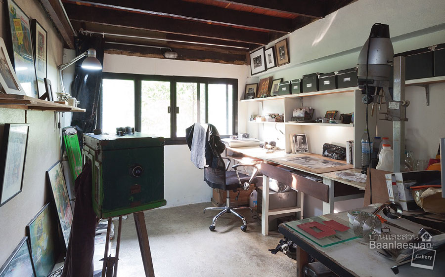 แบบบ้านไม้ในสวน หลังนี้ เป็นบ้านไม้ยกใต้ถุนสูงแบบบ้านไทยชนบท กั้นพื้นที่ส่วนใต้ถุนเป็นครัวและห้องมืดสำหรับงานถ่ายภาพ ข้างบนไว้อยู่อาศัย ที่น่าทึ่งคือการอยู่แบบรบกวนธรรมชาติให้น้อยที่สุดานไม้
