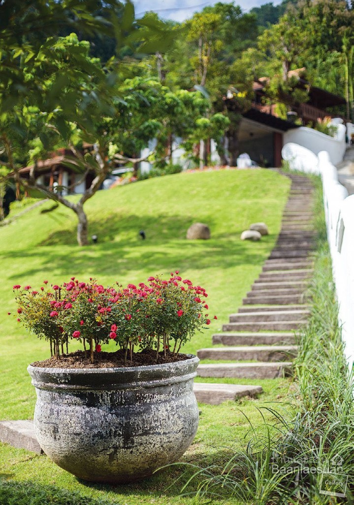 บริเวณนี้เป็นพื้นที่ในหุบเขาที่มีความชันจนแทบไม่เห็นที่ราบโดยธรรมชาติเลย แต่ก็ช่วยเติมเสน่ห์ให้ บ้านไม้ หลังนี้ได้ดี พันตำรวจเอก เกรียงศักดิ์ กัลยาวัฒนเจริญ เจ้าของบ้าน เล่าถึงที่มาของพื้นที่นี้ว่า