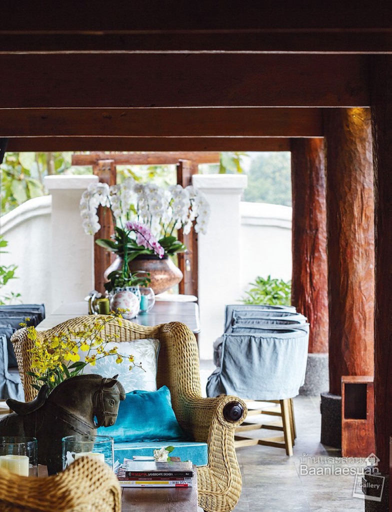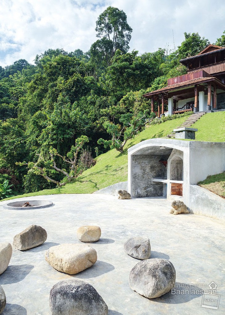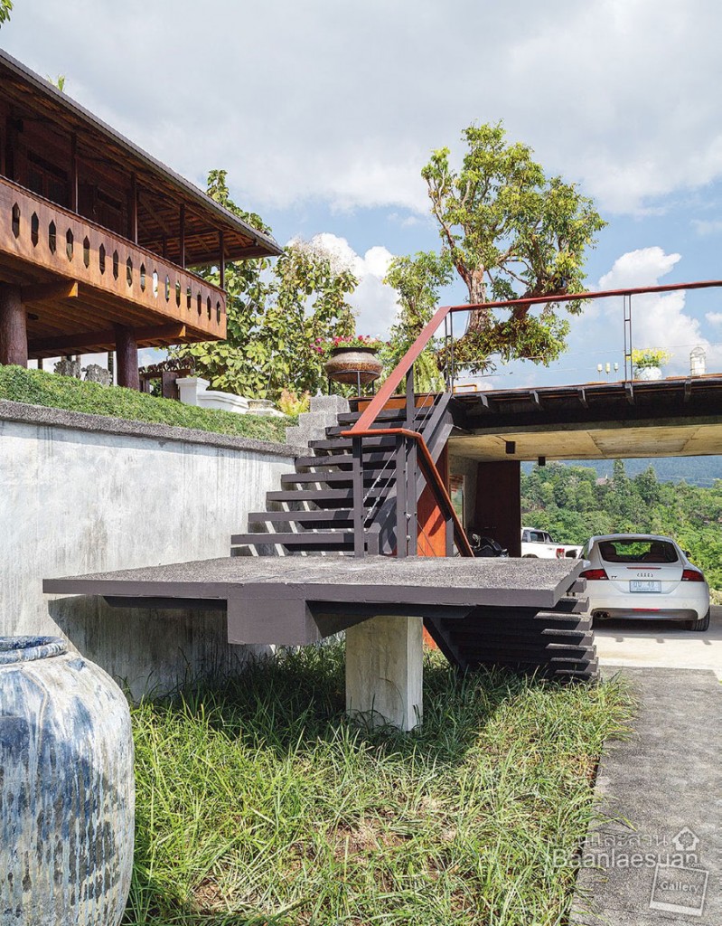จุดเด่นของบ้านที่หลายคนต้องอิจฉาคือทิวเขา เบื้องหน้า บ้านไม้ นี้ก็ออกแบบให้รับกับสิ่งที่ธรรมชาติสร้างมาให้ จึงสัมผัสได้ถึงความรู้สึกแสนสบาย โดยเฉพาะส่วนใต้ถุนบ้านซึ่งเป็นพื้นที่ส่วนรวมแบบบ้านไทยที่ใช้งานมากที่สุด มีการตกแต่งแบบไม่เป็นทางการจนเกินไป ได้บรรยากาศของบ้านพักผ่อน เราทิ้งท้ายด้วยคำถามว่าเจ้าของบ้านชอบอะไรในบ้านหลังนี้มากที่สุด คำตอบที่ได้ก็ไม่ต่างไปจากความรู้สึกของเราเลย นั่นคือ…“ผมชอบวิวเขาและหลองข้าวครับ”