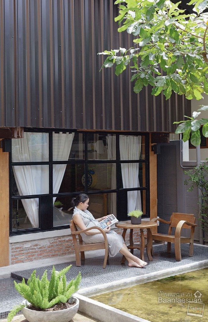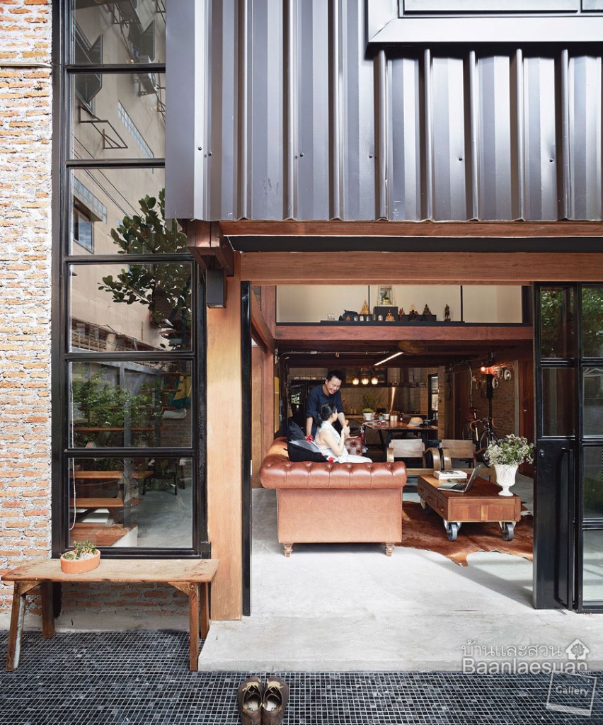 ผมสะดุดตากับการนำวัสดุสมัยใหม่อย่างแผ่นเมแทลชีตสีดำซึ่งไม่ค่อยได้เห็น นำมาใช้กรุผนังภายนอกตัวบ้าน เพื่อตกแต่งและทำหน้าที่เป็นผนังชั้นที่สอง ป้องกันความร้อนจากแสงแดดยามบ่ายไม่ให้เข้าสู่ตัวบ้าน หน้าตาของบ้านเปลี่ยนไปมากเมื่อเปลี่ยนประตูไม้บานเล็กๆของเดิมเป็นประตู โครงเหล็กกรุกระจกขนาดใหญ่ที่เลื่อนเปิด-ปิดได้สะดวก ช่วยให้บ้านดูโปร่งและสว่างขึ้น คุณต้นรื้อพื้นบ้านชั้นสองออกบางส่วน เพื่อเปิดให้พื้นที่รับแขกด้านหน้ากลายเป็นโถงเพดานสูงต่อเนื่องไปยังแนว บันไดที่ย้ายมาและระเบียงทางเดินที่นำไปสู่ห้องนอนใหญ่ด้านบน