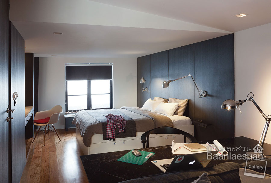 หัวใจของที่นี่ไม่ใช่ส่วนรับแขกอย่างที่เราคุ้นเคย แต่เป็นครัวที่ตั้งใจออกแบบให้ต่อเนื่องเป็นพื้นที่เดียวกับส่วนรับประทาน อาหาร เน้นการใช้งานจริง ตั้งโต๊ะกลางขนาดใหญ่ที่นอกจากจะใช้รับประทานอาหารแล้ว ยังปรับเป็นมุมทำงานสบายๆ มุมประชุมงานเมื่อจำเป็น หรือพื้นที่อเนกประสงค์ จึงเป็นมุมที่คุณต้นและคุณอ้อชอบมากที่สุดในบ้าน