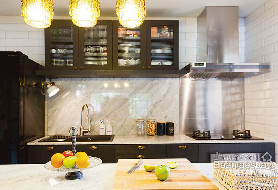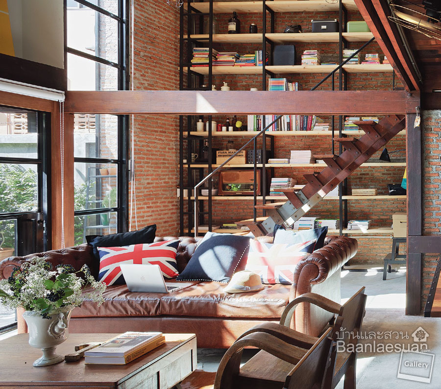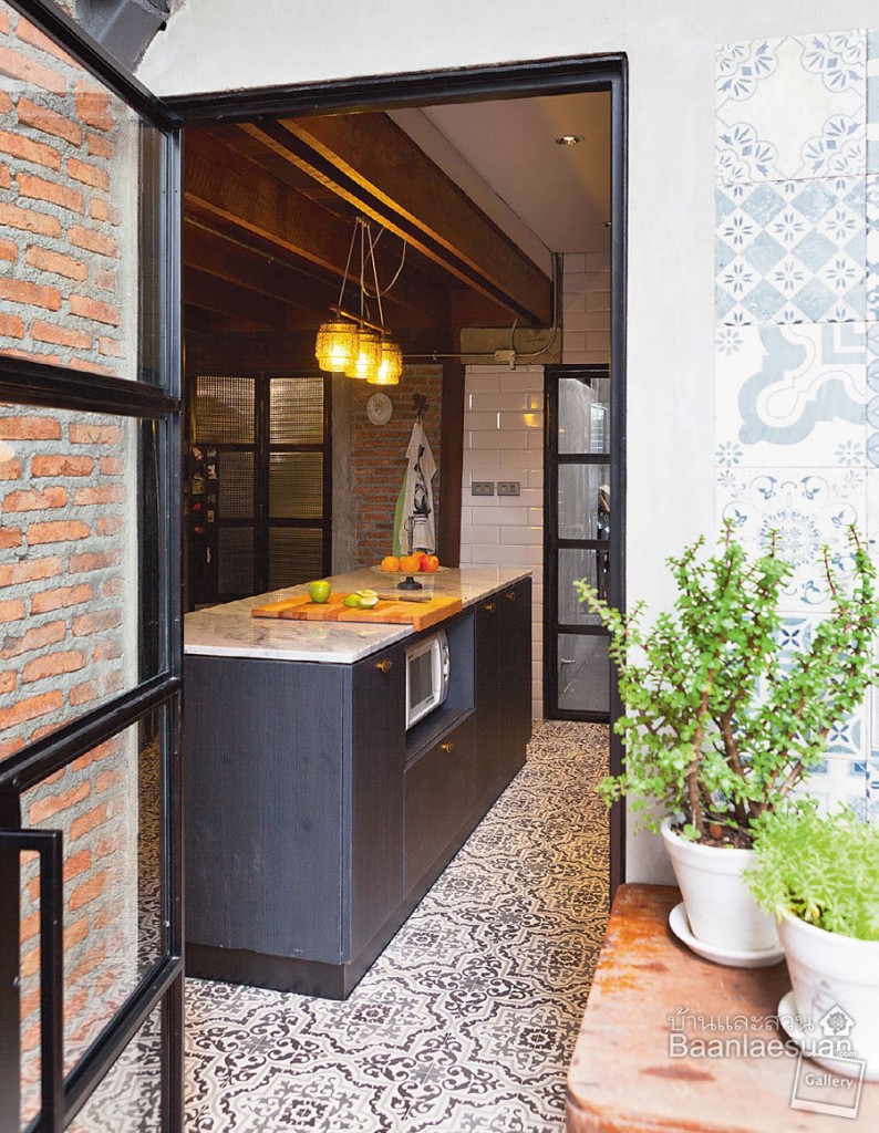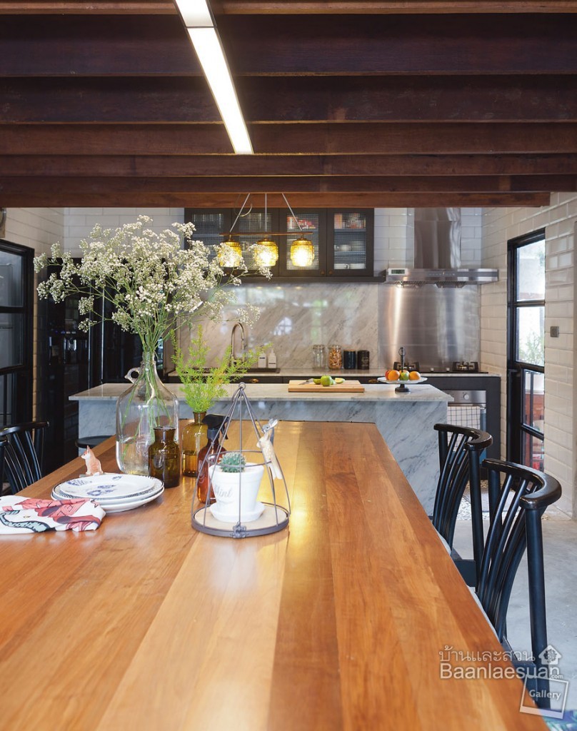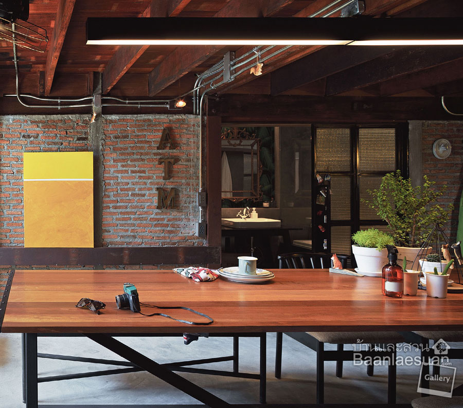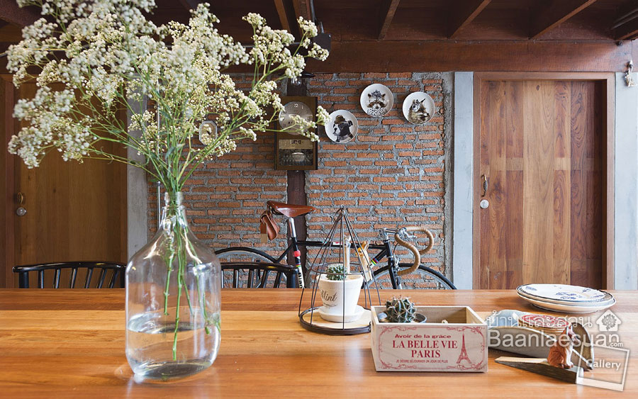 เจ้าของบ้านเลือกสไตล์มิกซ์แอนด์แมตช์ที่มีกลิ่นอายอินดัสเทรียลลอฟต์มาเป็นตัวประสานบรรยากาศของบ้านเก่าและของตกแต่ง เก่าให้เข้ากับการจัดพื้นที่ใช้สอยแบบใหม่ เน้นการโชว์พื้นผิวที่แท้จริงของวัสดุ อาทิ ผนังก่ออิฐ เสา คาน และพื้นไม้ ซึ่งเป็นของเดิมตัดกับพื้นผิวมันวาวของหินและกระเบื้องที่นำมากรุท็อปเคาน์ เตอร์และผนังด้านหลังครัว เป็นการผสมผสานสไตล์และรายละเอียดการออกแบบไปพร้อมกับเรื่องราวเก่าและใหม่ที่คละเคล้ากันไป เป็นจุดเริ่มต้นของชีวิตครอบครัว ขณะเดียวกันก็เป็นจุดเริ่มต้นของความทรงจำในอดีตที่ได้กลับมาโลดแล่นใหม่อีกครั้ง