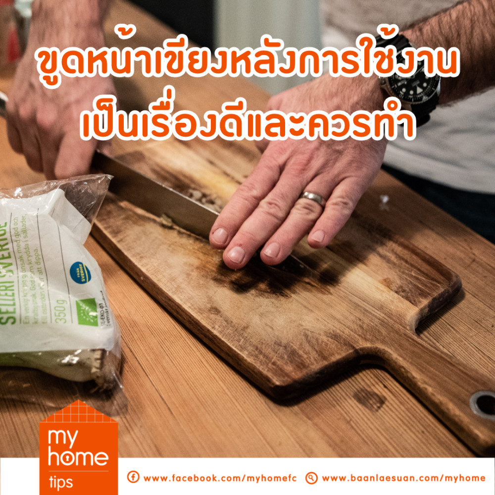 ทุกครั้งที่ใช้เขียงไม้เสร็จการทำความสะอาดเพื่อเคลียร์คราบสกปรกและเมือกมัน ๆ จากการหั่นเนื้อสัตว์ออกไป นอกกจากการล้างด้วยน้ำยาล้างจานพอให้หมดคราบมันแล้ว ก็ควรจะขูดหน้าเขียงออกเป็นประจำด้วยมีดค่ะ เพราะการขูดหน้าเขียงก็เป็นเหมือนการกระตุ้นใช้รูพรุนในเนื้อไม้สร้างสารที่มีคุณสมบัติช่วยยับยั้งการเจริญเติบโตของแบคทีเรียซึ่งในเขียงไม้ท่อนทุกประเภทมีอยู่แล้วตามธรรมชาติ จากนั้นล้างเขียงน้ำสะอาด ไม่จำเป็นต้องล้างซ้ำด้วยน้ำยาล้างจานอีกรอบ เพราะจะเป็นการชำระล้างสารดังกล่าวออกไป แถมยังทำให้เขียงขึ้นราได้ง่านอีกด้วยค่ะ จากนั้นซับเขียงให้แห้ง แล้วทาเคลือบผิวเขียงด้วยน้ำมันพืชทิ้งไว้ 1 คืนก่อนนำไปใช้ เพียงเท่านี้เขียงไม้อันโปรดก็อยู่ห่างไกลจากเชื้อราแล้ว