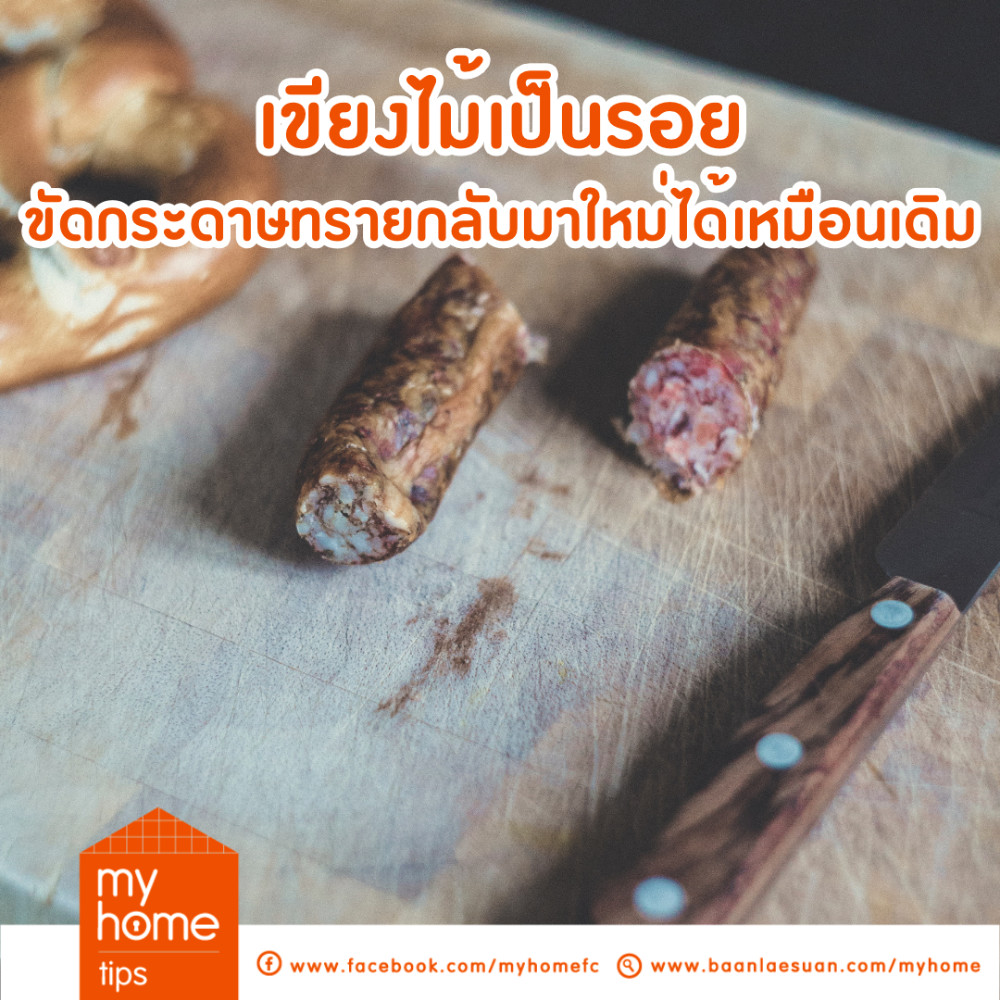 เขียงไม้ เป็นรอย ใช้กระดาษขัดหน้าเขียง กลับมาใหม่ได้เหมือนเดิม