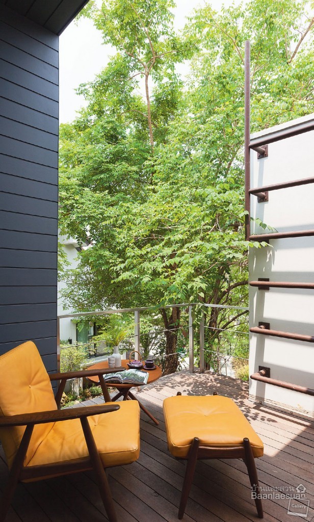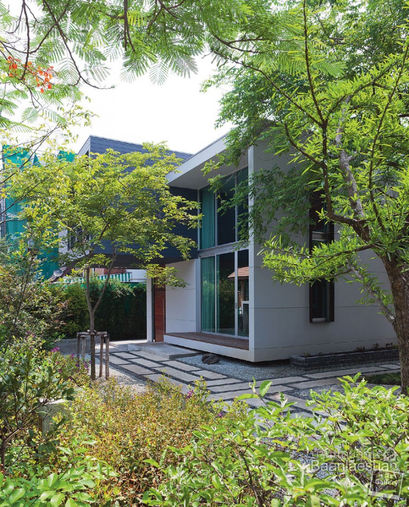 “เดิมพื้นที่ด้านข้างของบ้านทั้งสองหลังซึ่งเป็นส่วนเชื่อมต่อระหว่างกันจะเป็นส่วนจอดรถและทางเข้าหลัก ต่อมาปรับให้ประตูทางเข้าหลบไปอยู่ริมซ้ายและขวา เปิดพื้นที่ส่วนกลางให้เป็นสวนสีเขียวขนาดใหญ่ กลายเป็นมุมนันทนาการระหว่างบ้านทั้งสองหลัง”