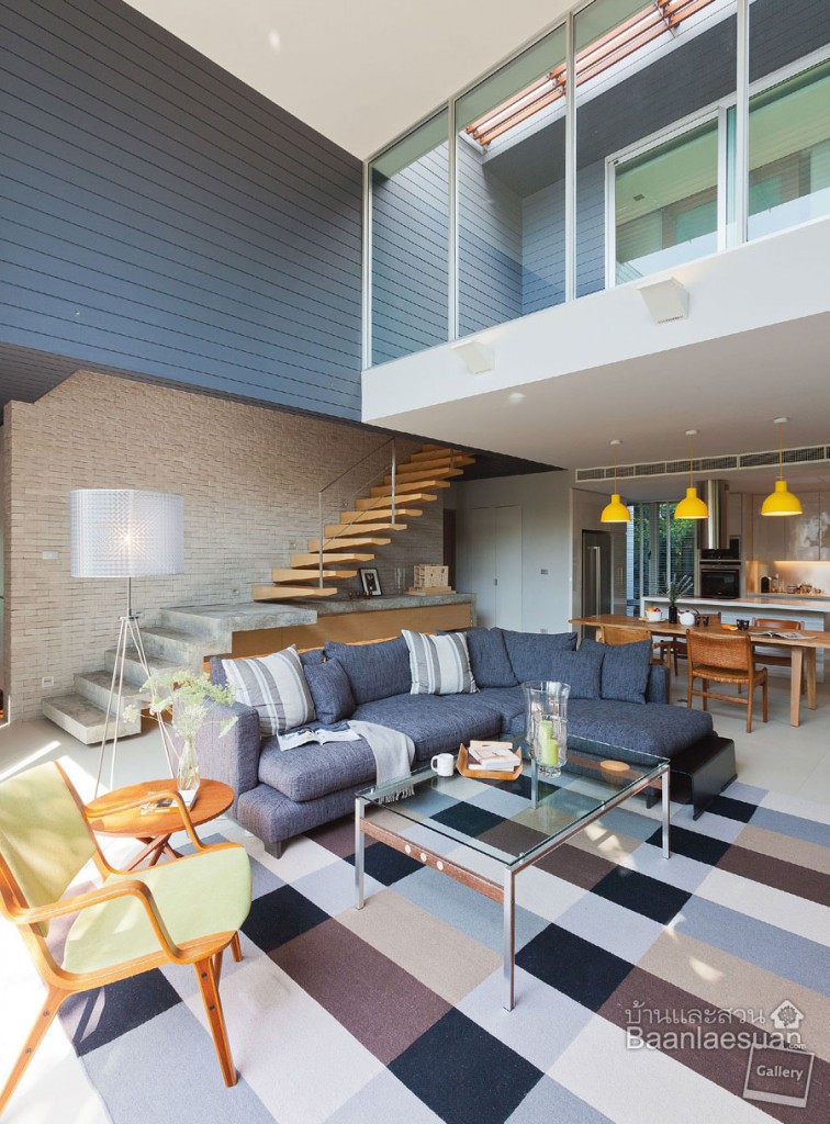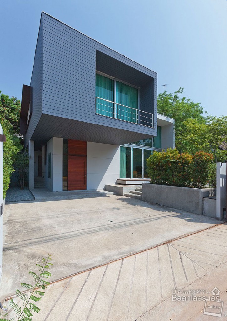 บ้านหลังใหม่สไตล์โมเดิร์นมีพื้นที่ใช้สอยประมาณ 350 ตารางเมตร มองจากภายนอกดูเหมือนนำกล่อง 3 ใบต่างขนาดมาจัดวางร่วมกัน การตกแต่งทั้งภายนอกและภายในใช้สีขาว – เทา ร่วมกับวัสดุกรุผนังบนชั้นสองซึ่งทำจากอะลูมิเนียมสีน้ำเงินอมเทา สร้างความโดดเด่นและเป็นเอกลักษณ์ให้บ้านหลังนี้ ผมสะดุดตากับโถงหน้าประตูซึ่งทำเป็นตู้เก็บของขนาดใหญ่ร่วมกับชั้นเก็บรองเท้าที่ออกแบบให้เป็นส่วนหนึ่งของบันได เป็นการใช้ประโยชน์จากพื้นที่ว่างเปล่าได้อย่างแนบเนียนและลงตัว