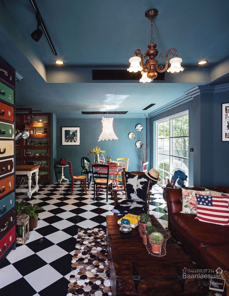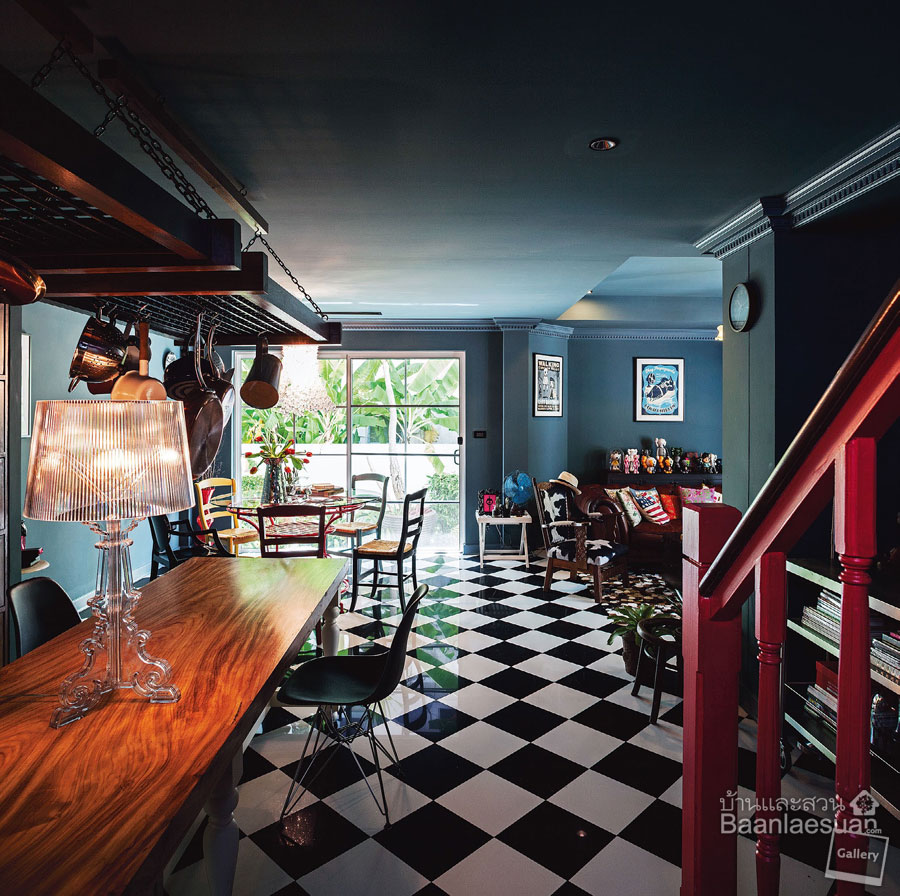 สังเกตว่าการตกแต่งภายในนั้นมีกลิ่นอายของเมืองนิวยอร์กซึ่งเจ้าของบ้านเคยไปใช้ชีวิตอยู่ เช่น กระเบื้องในครัวก็เลือกใช้กระเบื้องเซรามิกเหมือนในสถานีรถไฟใต้ดินของนิวยอร์ก รวมถึงการจัดแปลนที่ให้อารมณ์นึกถึงเมื่อครั้งเคยอยู่ในอพาร์ตเมนต์ ซึ่งออกแบบพื้นที่ใช้งานแบบ open plan รวมถึงการจัดวาง