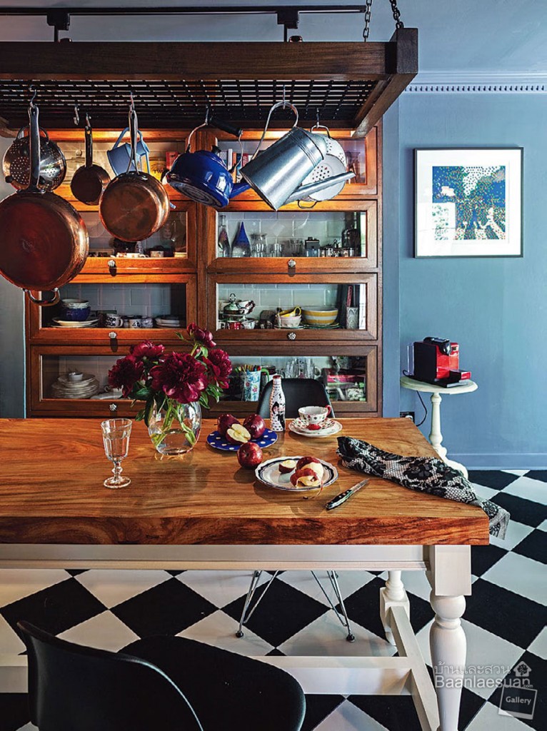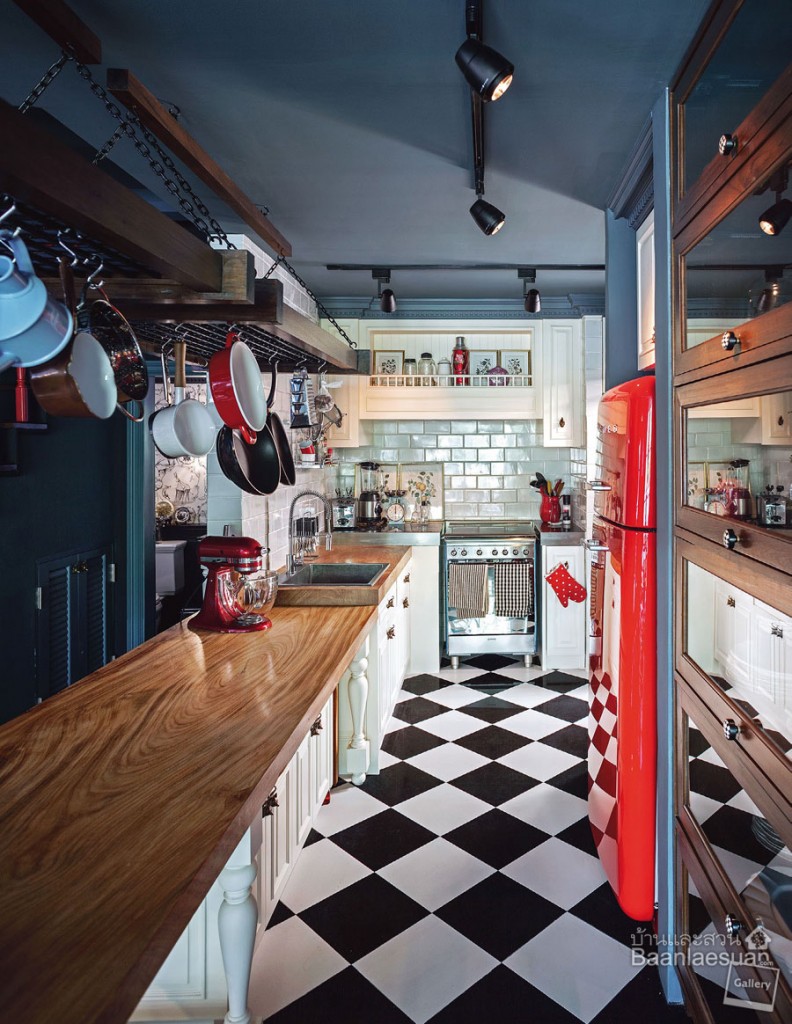 เครื่องซักผ้าและเครื่องอบผ้าซ้อนกันในบริเวณครัว นอกจากนี้คุณเอยังนำของสะสมของเจ้าของบ้านอย่างของเล่นทำจากไวนิล ภาพศิลปะ หรือเครื่องครัว มาออกแบบจัดวางให้เจ้าของบ้านได้เห็นและสัมผัส มากกว่าเก็บในตู้โชว์เพียงอย่างเดียว