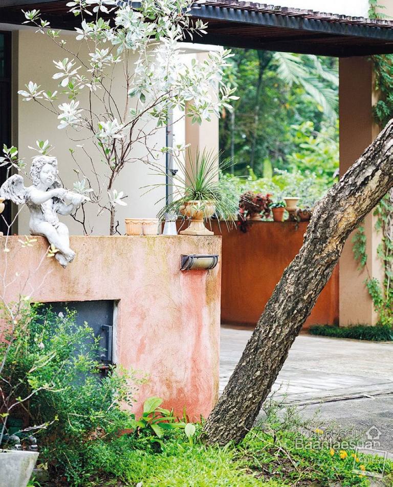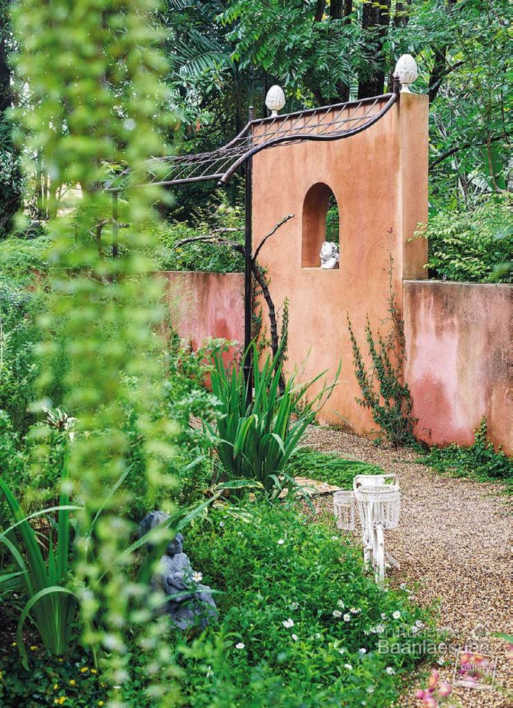 แสงแดดแผ่วเบาตกกระทบผนังสีอิฐดูอบอุ่นงดงาม ช่างเป็นบรรยากาศที่เรียกพลังได้ไม่น้อยในเช้าตรู่วันนี้ นับเป็นอีกครั้งที่เราเดินทางมายังหมู่บ้านร่มไม้ชายคลองในย่านพระราม 2 หลังเคยมาถ่ายสวนของบ้านหลังหนึ่งเมื่อหลายปีก่อน ครั้งนี้เรากลับมาพบกับผู้ออกแบบคนเดิม คุณวิทย์ – ศิริวิทย์ ริ้วบำรุง แห่ง Little Tree ซึ่งบอกกับเราว่า การออกแบบสวนของบ้านแต่ละหลังให้แตกต่างกันก็ถือเป็นความท้าทายและได้สนุกไปกับความคิดสร้างสรรค์ใหม่ ๆ อยู่เสมอ สวนสไตล์ทัสกานี