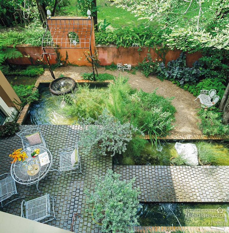“หมู่บ้านนี้พี่ทำมาแล้วสองหลัง หลังนี้เป็นหลังที่สาม แปลนบ้านเหมือนกัน ฮาร์ดสเคปที่มีอยู่ในสวนเดิมก็เหมือนกัน คือมีบ่อน้ำและต้นไม้ขึ้นร่มครึ้มแบบสวนทรอปิคัล หลังแรกพี่ออกแบบตามพื้นที่ออกมาเป็นสวนแบบโมเดิร์นผสมผสานกลิ่นอายคลาสสิกหน่อย ๆ พอมาหลังที่สองและสามเราก็ต้องปรับให้เยอะขึ้น ให้ดูไม่ซ้ำกัน มีความแตกต่างเฉพาะตัว เพราะว่าบ้านอยู่ใกล้เคียงกัน อีกอย่างถ้าทั้งสามสวนเหมือนกันก็ดูไม่มีเอกลักษณ์