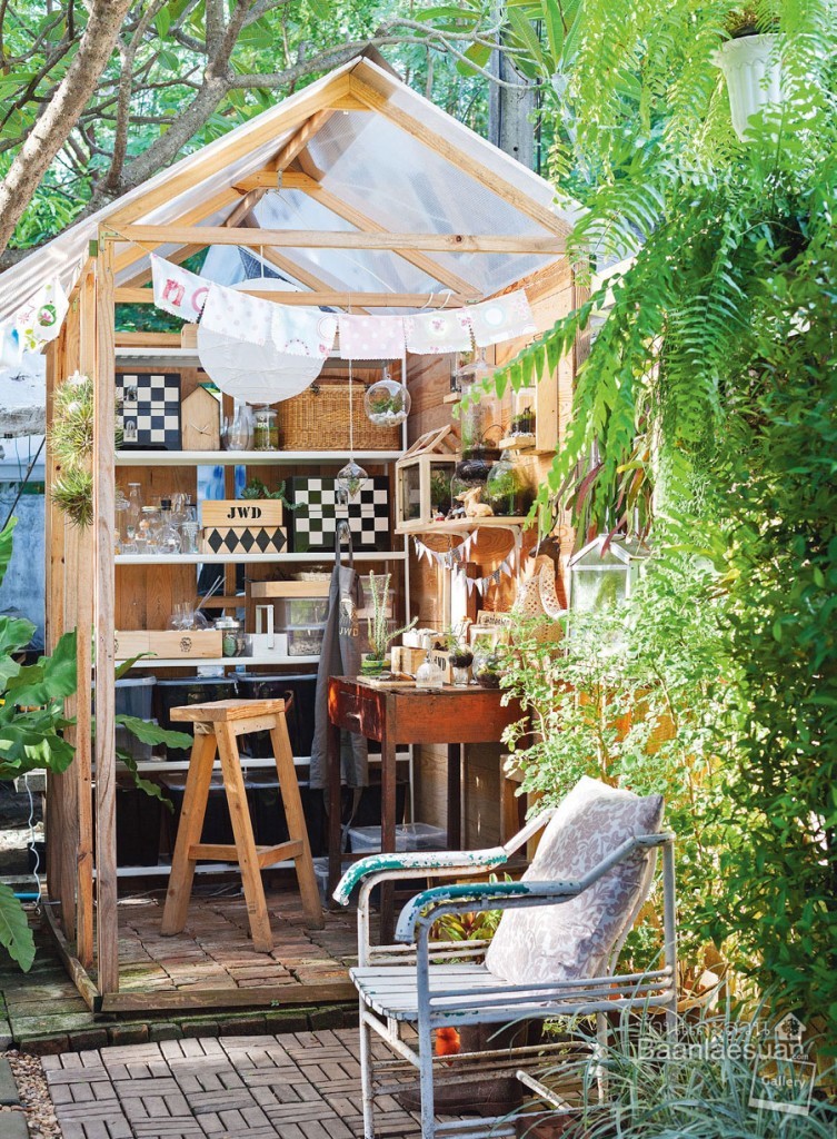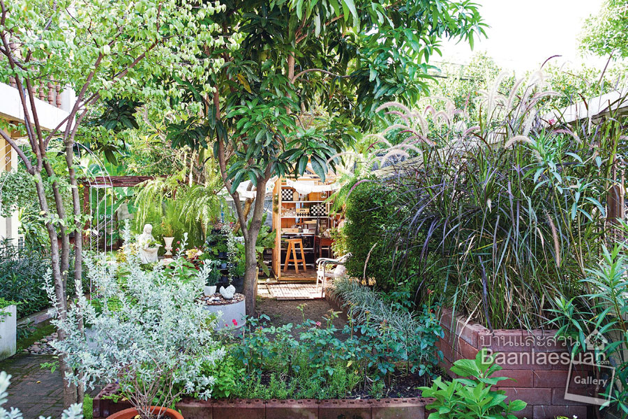 คุณโอ๋เป็นทั้งสถาปนิกและบรรณาธิการหนังสือเล่ม แผนกสถาปัตยกรรม ของสำนักพิมพ์บ้านและสวนอยู่แล้ว เรื่องการออกแบบจึงไม่เป็นปัญหา มีการวางแปลนสวนนี้ไว้อย่างคร่าวๆในขนาดพื้นที่ประมาณ 50 ตารางเมตร โดยคำนึงถึงการใช้งานของคนในบ้านเป็นหลัก รูปแบบเป็นสวนกระบะและสวนกระถาง เพื่อการดูแลได้ง่าย กระถางในสวนส่วนใหญ่ก็ทำจากวัสดุปูนปั้น มีรูปทรงต่างกันออกไป แต่เข้ากับสไตล์ของสวนนี้ได้ดี ส่วนกระบะปลูกต้นไม้สร้างจากบล็อกประสานที่นำมาเรียงต่อกัน โดยตั้งใจออกแบบให้มีความสูงเหมาะกับการนั่งเก้าอี้แล้วสามารถทำสวน ตัดแต่งกิ่งไม้ได้สะดวก เพราะคุณแม่ของคุณโอ๋เองก็ชอบทำสวน แต่ด้วยอายุที่มาก จะยืนนานๆก็ไม่ไหว หากก้มมากๆก็ไม่ถนัด นี่จึงเป็นอีกเหตุผลหนึ่งให้สวนนี้มีรูปแบบอย่างที่เห็น เป็นการออกแบบที่ตั้งใจทำขึ้นเพื่อคุณแม่ของคุณโอ๋นั่นเอง