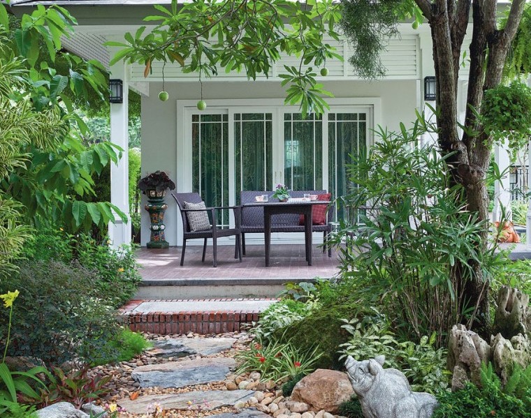 ตลอดเวลาที่เดินชมบรรยากาศสวนซึ่งมีพื้นที่ประมาณ 1 ไร่ รู้สึกได้ถึงบรรยากาศอันร่มรื่นเย็นสบายตามสไตล์ของสวนเมืองร้อนผสมผสานกับกลิ่นอายของสวนไทย มีการปลูกพรรณไม้ดอกหอมอย่างโมกพวง พุดเศรษฐี พุดสามสี โดยตัดแต่งทรงพุ่มไว้อย่างเรียบร้อย ประดับด้วยของแต่งสวนอย่างอ่างบัวและตุ๊กตาดินเผา ซึ่งเป็นไปตามแบบที่เจ้าของบ้านชอบ อาจารย์ชาตรีบอกเล่าถึงการออกแบบสวนแห่งนี้ไว้ว่า